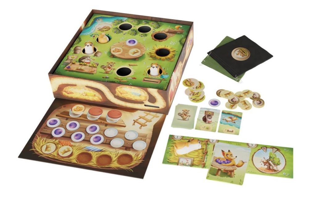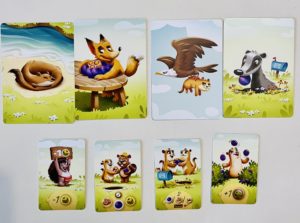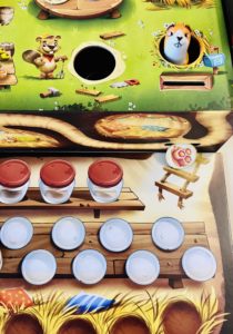 Les actions proposées sont variées pour ce jeune public. Il est possible de récolter des ressources dans les buissons ou dans la galerie. Pour cela, il suffit de piocher à l’intérieur du sac associé, laissant alors une grosse part au hasard. Mais attention, on ne gagne pas toujours des effets bénéfiques. Parfois il vous arrive des ennuis comme quand on pioche une belette ou un blaireau. Si l’on place son chien de pairie chez Hector le castor, on pioche une amélioration valable pour toute la partie. Chez Léon le hérisson, on peut échanger des baies pourries contre de belles ressources utiles pour passer l’hiver.