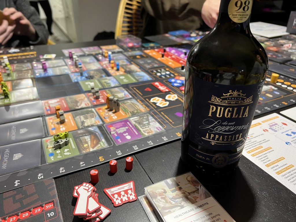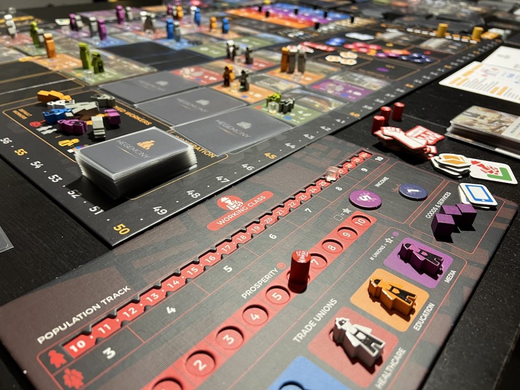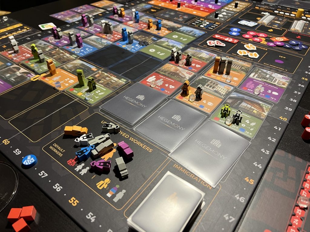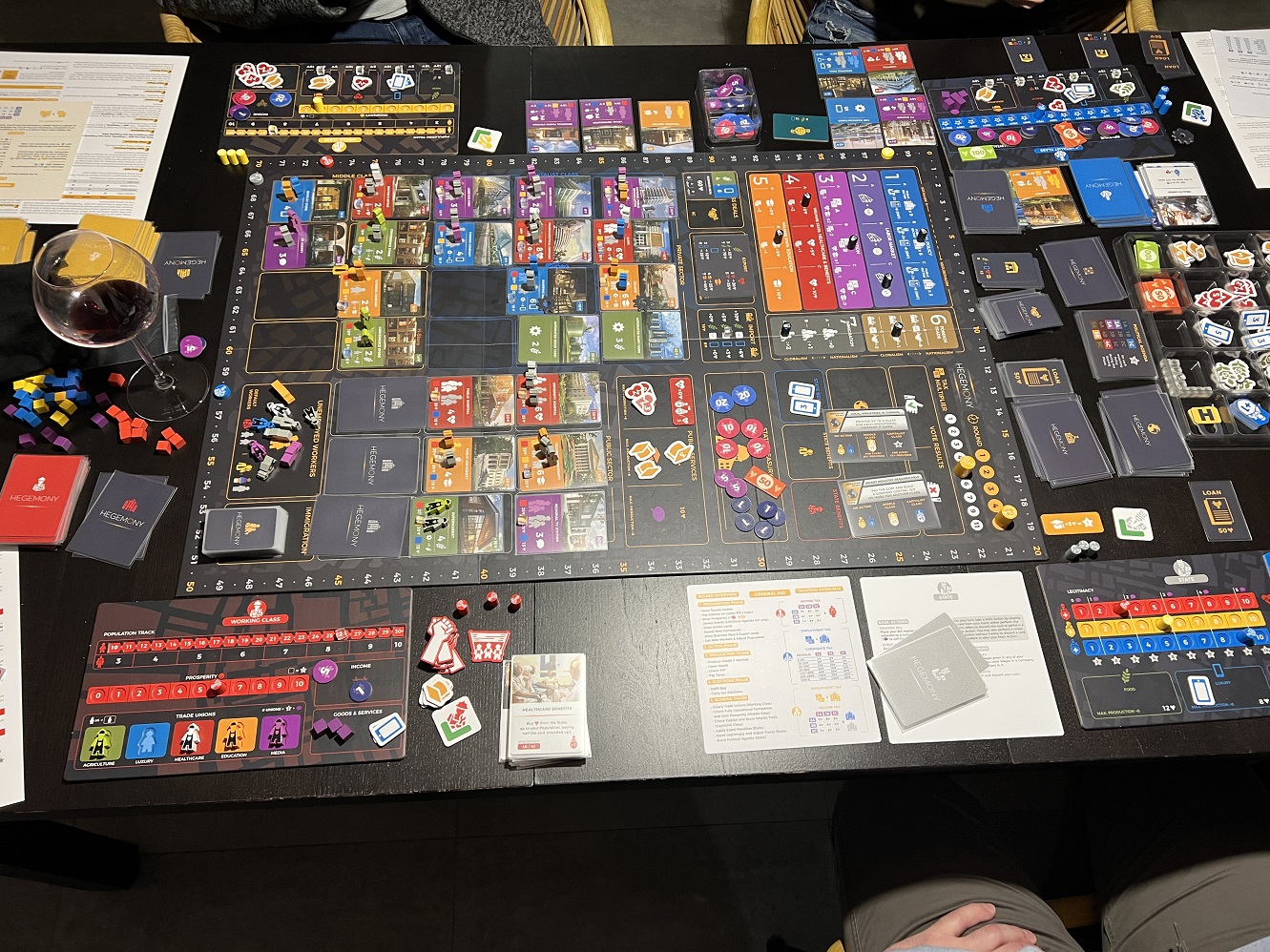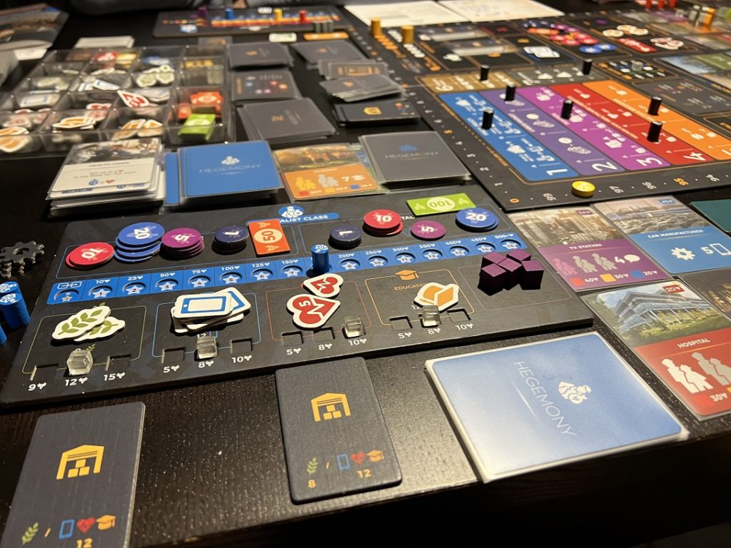Pour moi toutes les cases sont cochées, j’ai beaucoup aimé Hegemony et j’ai hâte de rejouer. Le jeu a été parfaitement équilibré ça a dû être un gros travail. Même si les Capitalistes sont plus faciles à jouer et gagneront sans doute en première partie. Je comprends certaines critiques mais que je ne partage pas. La répétitivité de partie en partie. Bon avec une seule au compteur je ne peux parler que de ressenti mais grâce aux automats quelque soit le nombre de joueurs on peut jouer toutes les classes, donc ça va changer de partie en partie. Au sein d’une classe certes on a toujours la même stratégie mais l’interaction fait tout car tout dépendra des autres et l’orientation de la partie variera avec les joueurs. En plus il y a l’état et ses agendas, ses évènements changeant et changeant son jeu, là ça varie bien plus pour cette « classe ». Enfin les extensions, entre les évènements historiques et surtout les objectifs personnels forcément là encore de la variation. Et les cartes actions en grand nombre pour chaque classe. Il n’y a qu’à rejouer pour voir 😉