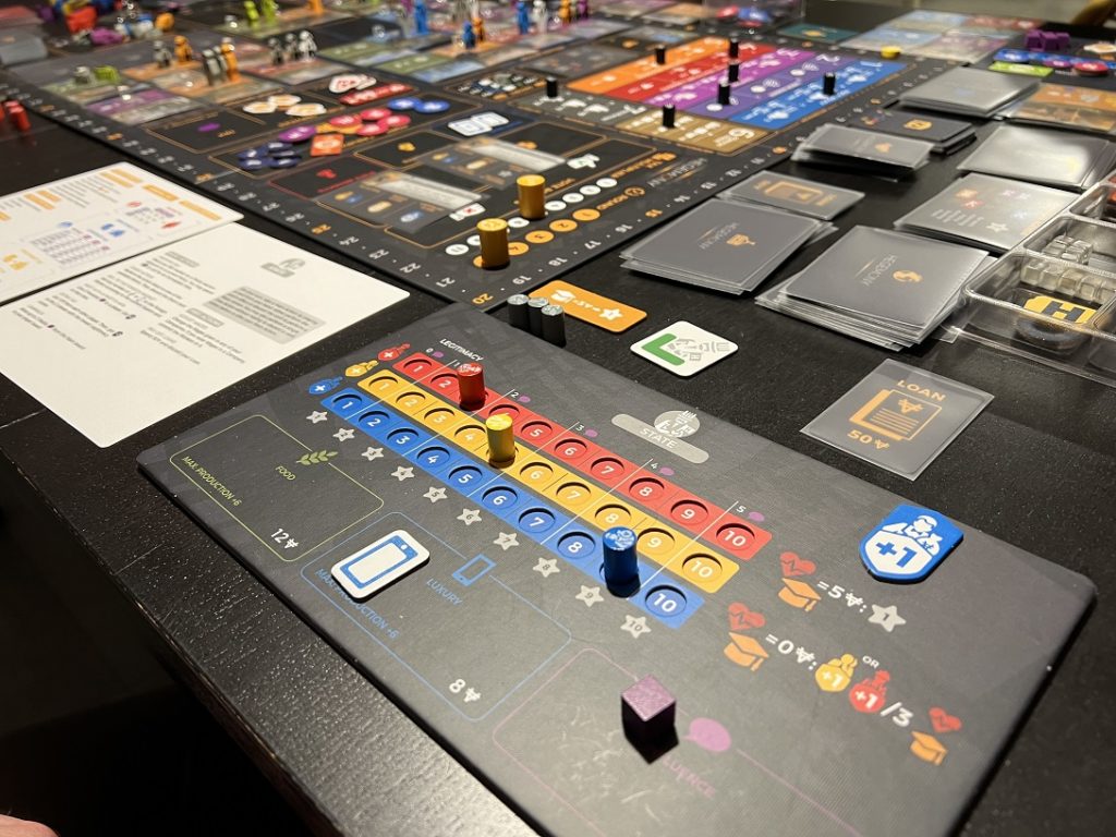 Et les différences ne s’arrêtent pas là. En effet, la toute grande qualité d’Hegemony est son thème et la manière dont il est appliqué aux mécaniques. Nous sommes en pleine lutte des classes et un joueur va représenter la classe ouvrière, un autre la classe moyenne, un suivant la classe riche et un dernier le gouvernement. Si on joue à moins de 4, certains rôles ne sont pas joués. Et les mécaniques sont admirablement intégrées dans chaque rôle. La classe ouvrière va envoyer ses ouvriers dans les différentes entreprises (PME, Corporate ou Public) pour gagner des salaires, se nourrir et se former, elle pourra faire grève et organiser des manifs. La classe moyenne va envoyer ses employés dans les mêmes entreprises mais va aussi fonder ses propres PME (où les ouvriers pourront aller travailler) et acheter les mêmes biens que la classe ouvrière mais plus facilement tout en étendant son pouvoir d’achat à des biens de luxe comme des appareils téléphoniques mobiles 😉 Les riches vont eux fonder des Corporate qui engageront des ouvriers et des employés pour produire énormément et faire un max de profit. Ils devront néanmoins bien gérer leurs dettes. L’Etat lui va plus agir en tant que régulateur en offrant des biens et services à chaque classe et en veillant à ce que tout le monde soit heureux!