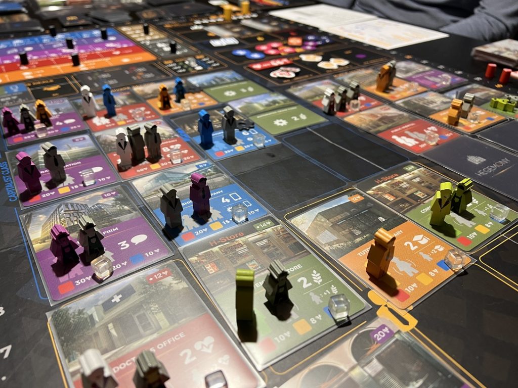La première est le choix d’action. Chaque rôle a un choix d’actions qui lui est propre. Hegemony se joue en 5 manches et, à chaque manche, chaque joueuse va, à son tour, réaliser une des actions de base possibles pour son rôle (chacune a un choix de 7-8 actions différentes). Elle pourra également, à son tour, réaliser une des actions gratuites possibles. Ces actions vont leur permettre, en fonction de leur rôle, d’envoyer des ouvriers/employés travailler dans des entreprises, former ses ouvriers/employés, fonder une nouvelle entreprise, produire, acheter ou vendre des biens, proposer une loi,…