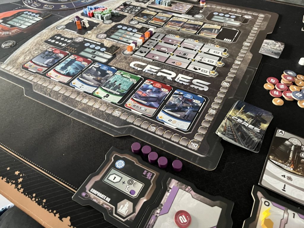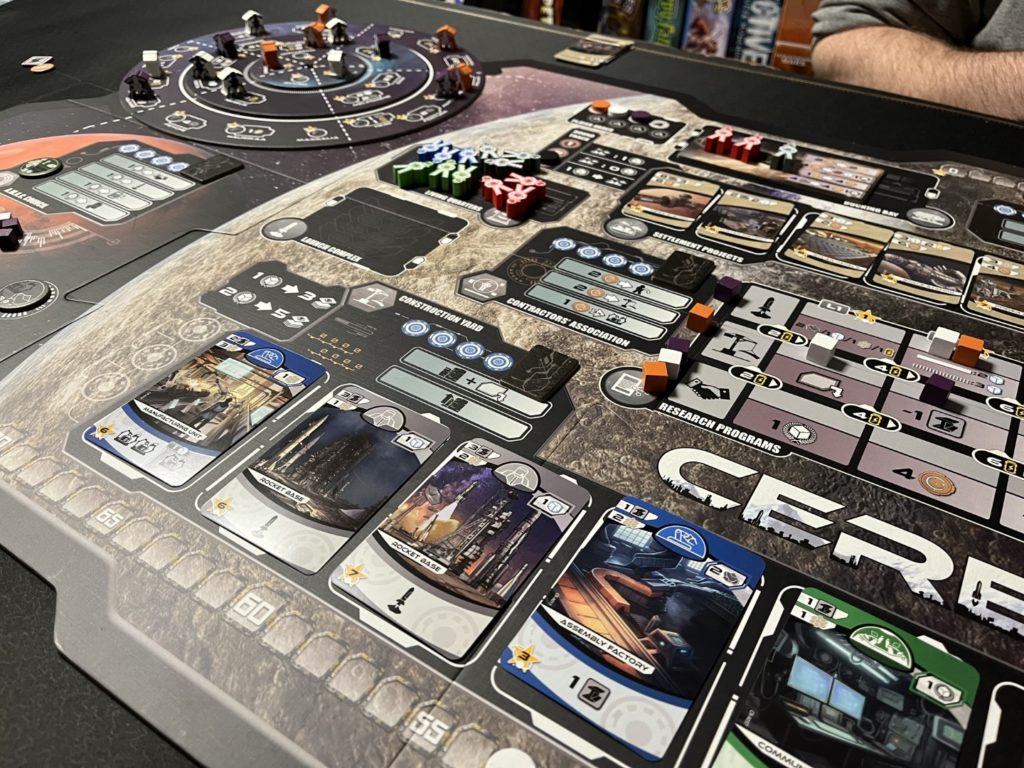 Ceres est un jeu de placement d’ouvriers de poids moyen qui présente une particularité intéressante, car à leur tour, les joueurs peuvent choisir soit de placer l’un de leurs propres ouvriers, soit d’effectuer une action avec un ouvrier du pool commun limité. Cela fournit un élément dans lequel le timing devient encore plus important que dans d’autres jeux de placement d’ouvriers. Il s’agit d’un simple jeu de gestion de ressources et de placement d’ouvriers où vous allez construire des usines qui vont produire des ressources et apporter différents bonus pour ensuite pouvoir réaliser les autres actions comme réaliser des objectifs et gagner des PVs. Rien de très original mais le jeu tourne bien et fait le taf. Il faut dire qu’il est bien ancré dans son thème surtout grâce à sa ceinture d’astéroide qui tourne bien et apporte un petit plus bien sympathique au jeu.