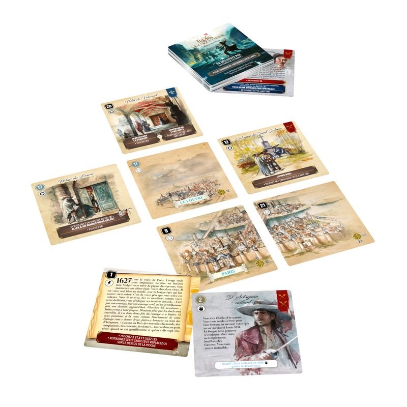 J’ai constaté des différences avec les titres précédents. Tout d’abord le format de la boîte. Alors qu’il n’était déjà pas bien grand avant, c’est maintenant un simple étui. Ensuite, certaines actions demandent de posséder un certain nombre de symboles qu’il faut compter dans les cartes en jeu mais aussi sur celles défaussées. Cette pratique m’a un peu dérangée car pour moi une carte défaussée est retirée du jeu, donc sans intérêt. Dans Les trois mousquetaires : l’honneur de la Reine il n’en est rien, il faut donc avoir toujours un œil sur cette défausse. Si l’histoire est très agréable, j’ai cependant eu le sentiment d’être beaucoup plus dirigée dans mes choix. Contrairement aux autres titres, il y a une chronologie à trouver pour avancer dans l’histoire, le jeu est donc moins ouvert. Il faut faire les choix dans le bon ordre pour posséder les symboles requis. Si ce n’est pas le cas, la suite de l’aventure tourne court. Dans ce scénario il faut trouver les deux fins possibles pour obtenir la victoire. J’ai la sensation que la conception du jeu n’est pas la même, ici il faut plus découvrir la trame pour que l’histoire arrive à son terme alors que dans Hollywood ou dans Vinland ou Lhassa on était plus dans une histoire que l’on est libre d’écrire en fonction de ses choix.