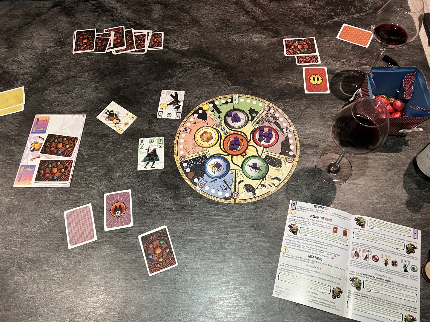 Au final, Bug Council of Backyardia est un jeu de plis intéressant: il est classique dans sa mécanique tout en offrant la possibilté de changer l’atout, ou l’ordre des forces des couleurs, en cours de partie. Ceci dit, on ne peut pas dire qu’on maîtrise ce changement. Et c’est peut-être mieux!
