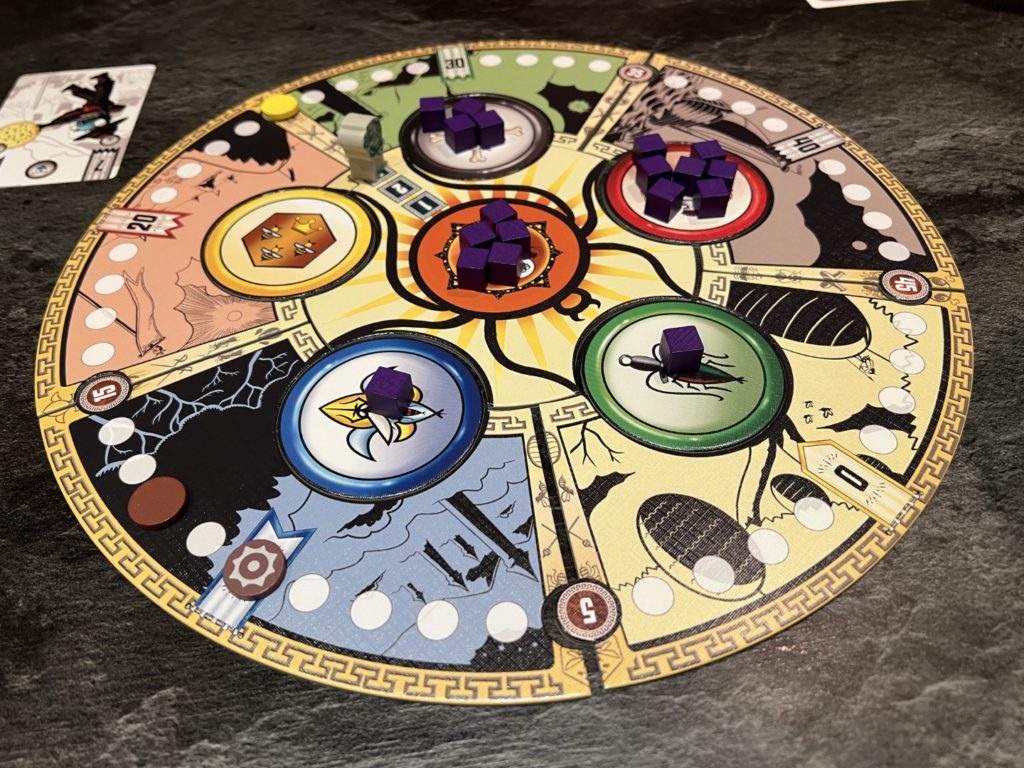 Mais attention, ce n’est pas tout. Le joueur ayant joué la carte la plus faible va choisir une des 5 couleurs, y prendre tous les cubes et les déposer, un à un, sur les couleurs suivantes à la manière d’un Awalé.