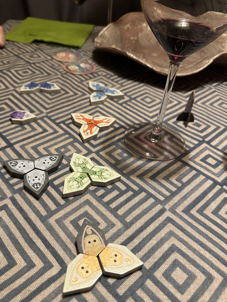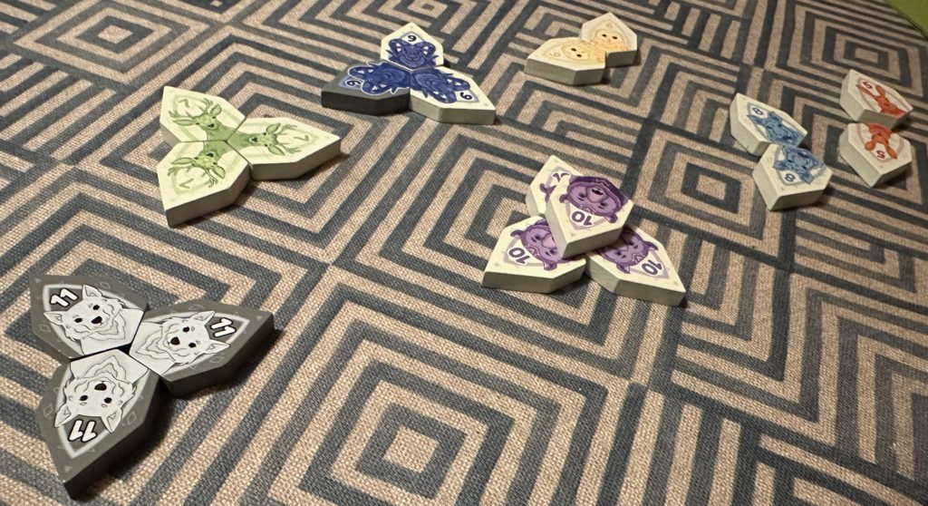 Chacun tentera donc de réunir 3 loups, valant 11 points, c’est mieux que les 10 points des ours du jeu de base. Mais personne n’est à l’abri de piocher un lapin ou un hibou qu’il faudra ajouter à son tableau. Ce qui diffère des 2 tuiles que l’on peut garder de côté.