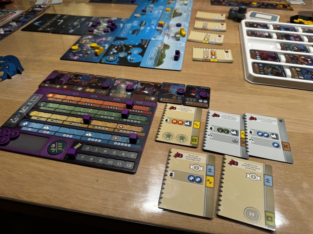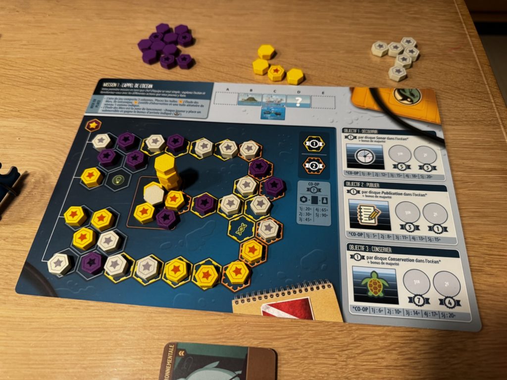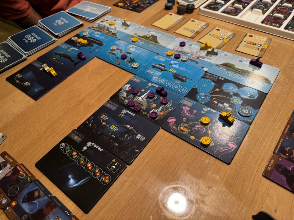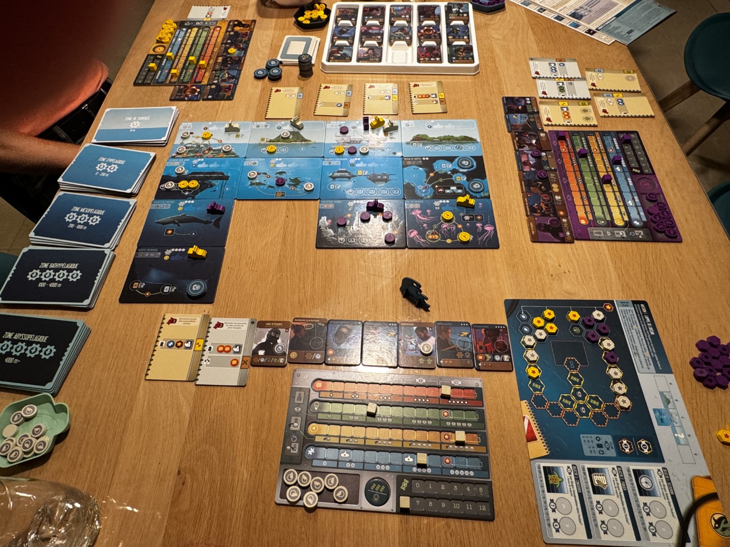 Le jeu n’est pas révolutionnaire: attributs de revenus, des spécialistes de niveaux différents qui permettent de faire une ou deux actions activables via des jetons actions qu’il faut donc bien gérer, un plateau central évolutif sur lequel ses submersibles pourront se déplacer pour effectuer les actions.