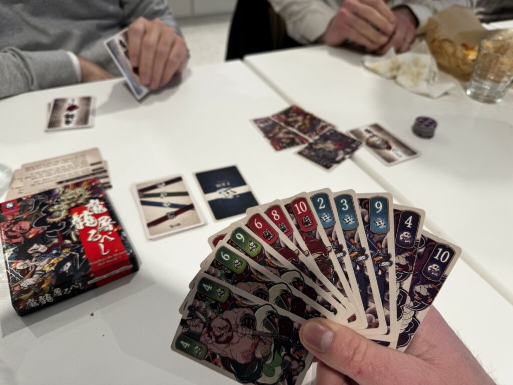 Un pote me disait l’autre jour que Slaughter The Dragon, c’était la dame de piques version 2.0 et je suis d’accord. Les 2 jeux sont très proches mais Slaughter apporte plus de méchanceté, de peps et de fun! Pourquoi? Parce que tout est décuplé : ramasser un cœur (ici un mauve) ne fait pas seulement perdre un point mais sa valeur faciale en points. Autant vous dire que ça fait mal quand vous prenez un pli rien qu’en mauve :-). On est souvent dépendant du hasard de la distribution et, bien souvent, on est démuni face à la situation. Il y a néanmoins des systèmes de compensation qui permettent à la joueuse qui possède la carte la plus forte en mauve de jouer avec deux mains de cartes: Au début de la manche, elle sépare sa main en 2 paquets puis elle joue totalement une de ses mains pour, ensuite, passer à l’autre. J’aime autant vous dire que ça apporte de nouvelles sensations.