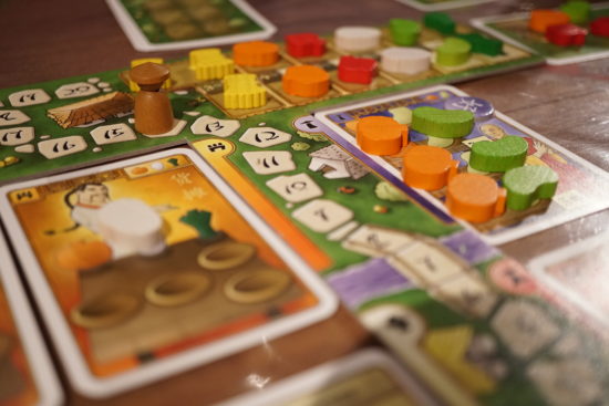 La seconde phase est plus classique et comprend moins d’interaction. Chacun à son tour va optimaliser son jeu de cartes devant soi: livrer ses clients dans les denrées désirées, échanger certaines denrées avec les étals, acheter ou vendre d’autres et utiliser les capacités spéciales de ses artisants. A noter que certains clients sont très exigeants et vous font perdre de l’argent si vous ne les livrez pas directement… J’adore la fin de cette phase où on peut avancer sur l’échelle des points de victoire en payant 1 pour avancer d’une case et en payant ce qui est inscrit sur la case suivante pour avancer de plusieurs cases. Si j’ai 10 points par exemple, en payant 1, je monte à 11 points, en payant 12 de plus, je monte à 12 points, en payant 13 de plus, je monte à 13 points,… Très chouette système.