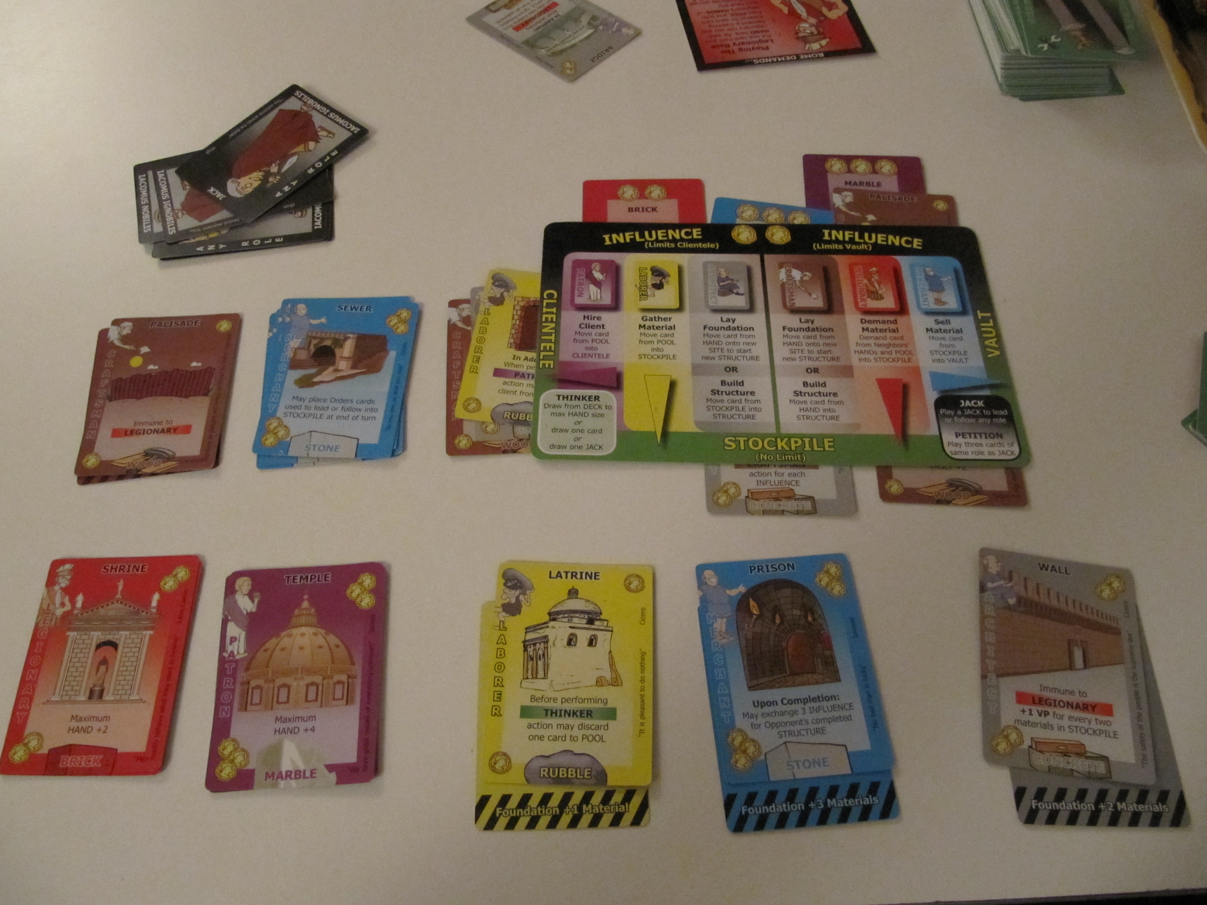 Notre partie a commencé de manière très tendue.  On avait chacun un ouvrier en tant que client et prenions rapidement toutes les cartes du lot commun dans son stock de telle sorte qu’on n’osait rapidement plus jouer aucune carte sous peine de favoriser les ouvriers adverses.  Le jeu a alors enchaîné la pioche et le jeu de sénateurs durant la première partie du jeu.  Assez frustrant et pas très fun comme début de partie.  Heureusement, cette première partie s’est débloquée dès qu’un des joueurs a réussi à construire un bâtiment, à savoir celui donnant une main de 7 cartes.  A partir de ce moment, inutile pour lui de piocher des sénateurs, il a alors joué ses cartes normalement.  Heureusement sinon ça allait de nouveau ressembler à la première partie jouée avec Philrey…
