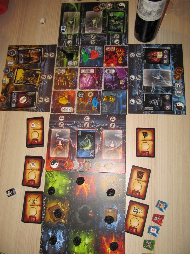 Ces choix ne sont pas très compliqués.  Dans notre partie, le Wu-Feng a tablé un max sur les catacombes.  Dès qu’il piochait un fantôme permettant une transformation en démon, il le faisait.  Sinon, il mettait une malédiction en jeu et enfin un fantôme. Peu de fantômes sont donc venus en jeu mais les Taoïstes n’ont pas prêté assez d’attention aux catacombes vu les maigres effets qu’ils devaient en subir.  Mais quand enfin le Wu-Feng a réussi à trouver les 3 urnes et qu’il a pu envoyer son ombre, le glas sonnait déjà pour les Täoïstes… sans pour autant que le Wu-Feng n’ai eu l’impression d’avoir spécialement bien joué.