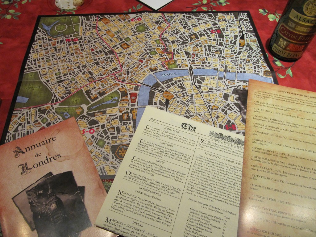 Vous avez à votre disposition différents éléments: 1 livre d’enquête dans lequel l’énigme est énoncée et où vous pourrez trouver le résultat de vos différentes investigations. Une carte de Londres vous permettant de situer les différents endroits de l’enquête et de vérifier les alibis de certains suspects en mesurant le temps qu’il doivent prendre d’un endroit à un autre. Un annuaire qui permet de connaître les adresses des différentes personnes liées à l’enquête. Et enfin le journal du jour qui donne certaines informations intéressantes.