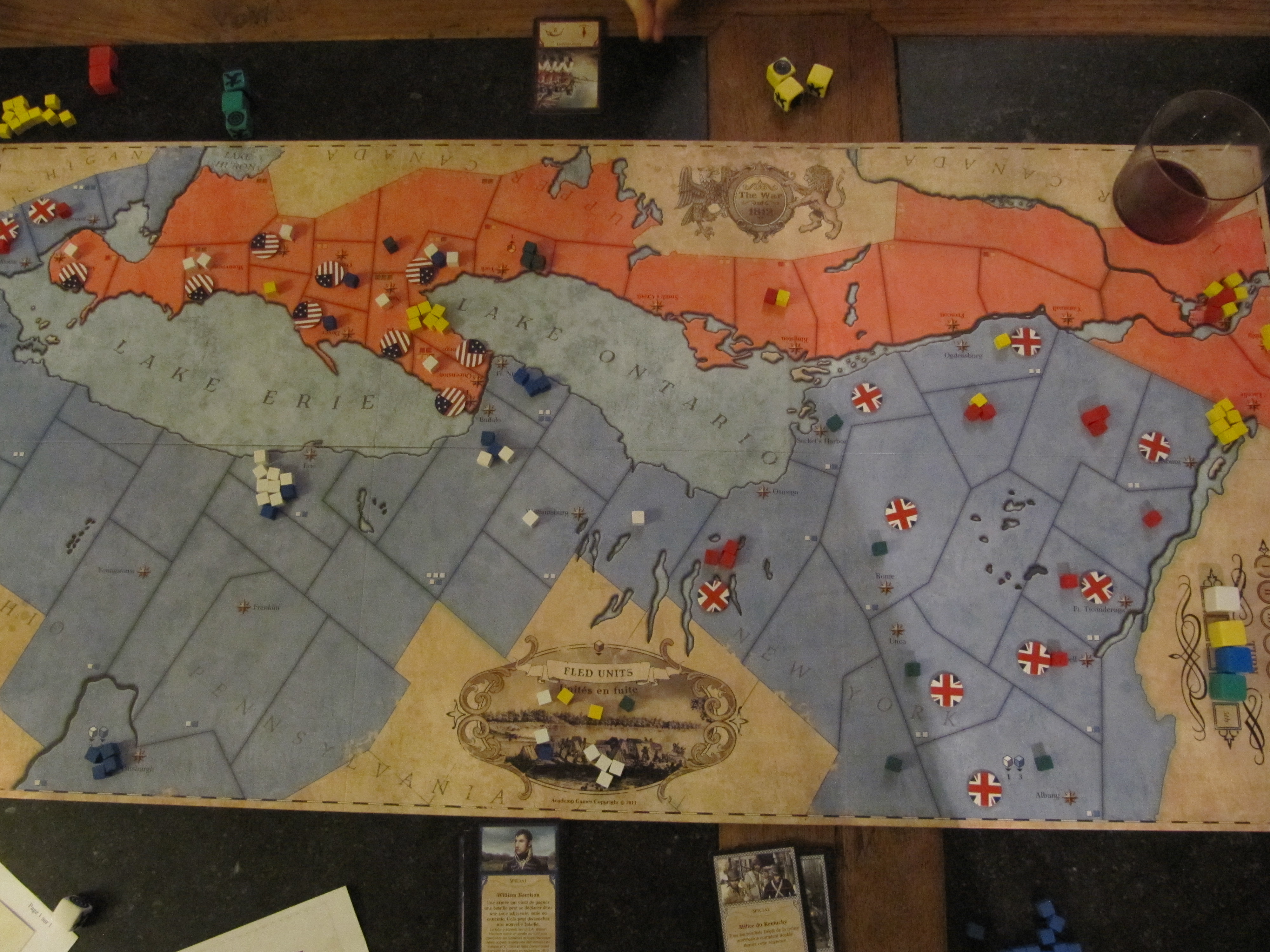 1812 l’invasion du Canada est donc un jeu de combat simple, au hasard fort présent mais à la tension prenante et où on ne voit pas le temps passer tout au long des 3 heures de jeu. Les retournements de situation sont nombreux et il est très agréable d’y jouer. Dans notre partie par exemple, l’Angleterre a fait vaciller les USA en s’emparant de tous ses territoires à l’Est tandis que les Américains ne possédaient encore aucun territoire ennemi. Les Américains ont pu tout de même rendre le change en envahissant tout l’Ouest du Canada. La partie s’est terminée à un seul point de différence. Un seul jet de dé aurait permis l’égalité…