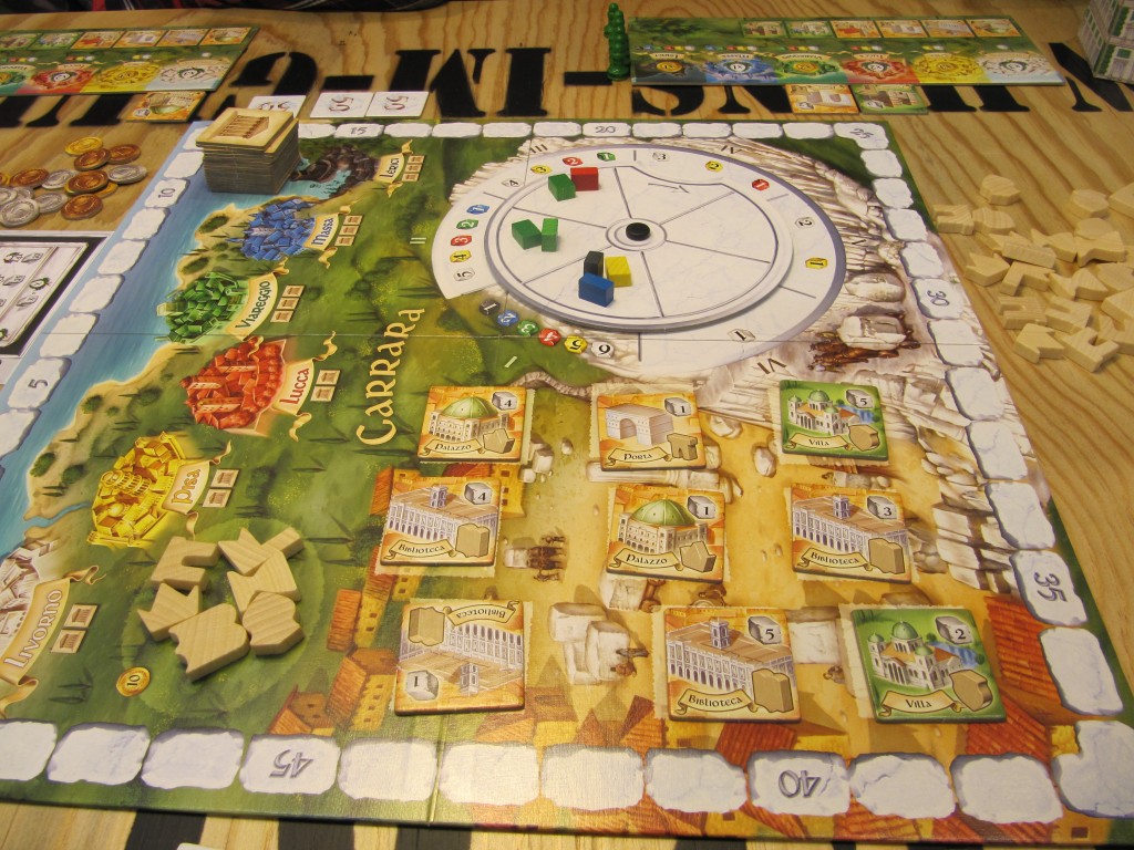 The Palaces of Carrara est un jeu extrêmement bien huilé à la sauce Allemande réalisé par le « couple » légendaire Kramer & Kiesling, les auteurs de Tikal, Java, Cavum,…