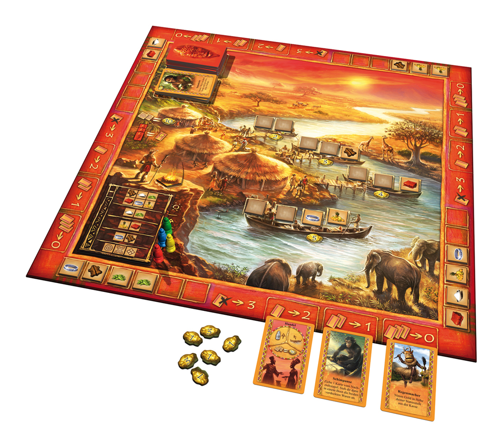 Ensuite le jeu en lui-même: le principe de base est qu’on doit récolter des matièrs premières pour répondre aux attentes du Shaman en lui « livrant » les combinaisons de matières qu’il attend. On va réaliser ça en jouant des cartes actions. Bonne astuce du jeu: à son tour on a 3 « points d’action » qu’on répartit comme on veut: soit on fait 3 actions mais alors on ne tire aucune nouvelle carte, soit on en fait 2 et on tire une nouvelle carte… Les cartes ont des pouvoirs variés, avec un certain nombre qui donnent de l’interaction avec les autres joueurs. C’est assez simple sur les principes, mais pas simpliste. On doit planifier un minimum, jouer ses cartes au bon moment, thésauriser à certains moments et « claquer » à d’autres…
