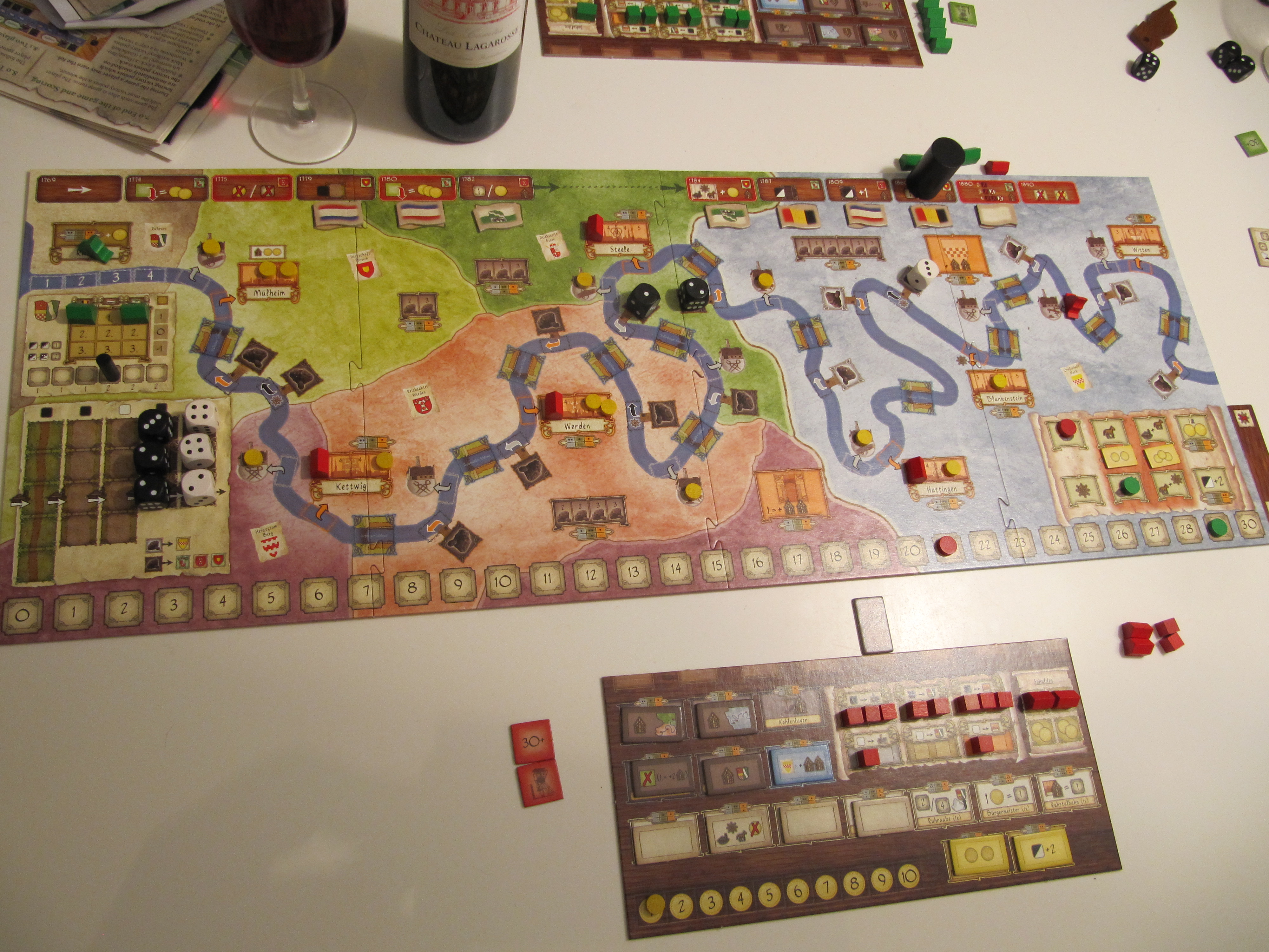 Ruhrschifffahrt 1769-1890 est un jeu sans hasard où les choix sont compliqués et cruciaux.  Une erreur suffit à vous faire perdre la partie sans espoir de revenir dans la partie.  Le jeu en lui même n’est pas très compliqué mais ses règles le sont.  Elles comprennent de nombreux détails dont plusieurs ne sont pas retranscrits sur une aide ou le plateau.  Il faut donc de temps en temps se plonger dans ces dernières, par exemple pour connaître le coût de construction des dépôts dans le port ou pour se souvenir des 7 phases de jeu.  C’est dommage car un peu plus de clarté sur le tableau, un peu moins de détails et d’exceptions dans les règles auraient permis au jeu d’être plus fluide et de rencontrer plus de succès.  Succès qu’il mérite par ses mécanismes innovants et fort proche du thème très recherché bien que peu sexy.  Bien qu’au début du jeu, une seule stratégie semble dominer (acquérir la possibilité de construire des écluses puis pouvoir naviguer dans le compté de la Mark puis construire des entrepôts à Ruhrort), dans la suite du jeu, les stratégies des joueurs peuvent être différentes dans l’obtention de points de victoire: par les écluses, par les entrepôts dans les villes, par les entrepôts dans les stockages de charbon ou dans le port de Rurhort (bien que sans entrepôt dans le port, votre chance de victoire s’amenuise).  Toute cette stratégie repose sur le choix de l’emplacement de départ de sa barque et celui de l’action spéciale.  Ces choix cornéliens et les nombreuses conséquences différentes le rendent très savoureux.  De plus, la gestion de l’argent est un aspect crutial du jeu.  Le jeu est très bien fait pour ça puisqu’il sera plus difficile d’en engranger au début qu’à la fin.  Transporter du charbon de grande valeur tout en construisant des écluses afin d’éviter les obstacles qui diminuent cette valeur,  choisir à bon escient l’action spéciale au coût pas trop élevé mais à l’effet judicieux à ce moment là, construire les entrepôts les moins chers mais les plus rentables,… sont d’autant de bonnes décisions à prendre afin de garder suffisamment d’argent pour construire les différents éléments permettant de gagner des PVs et de rembourser ses dettes pénalisantes à la fin.  Pour couronner le tout, son matériel et les couleurs du plateau sont splendides et contribuent à apprécier Ruhrschifffahrt 1769-1890.  (que de copié/collé 😉 )