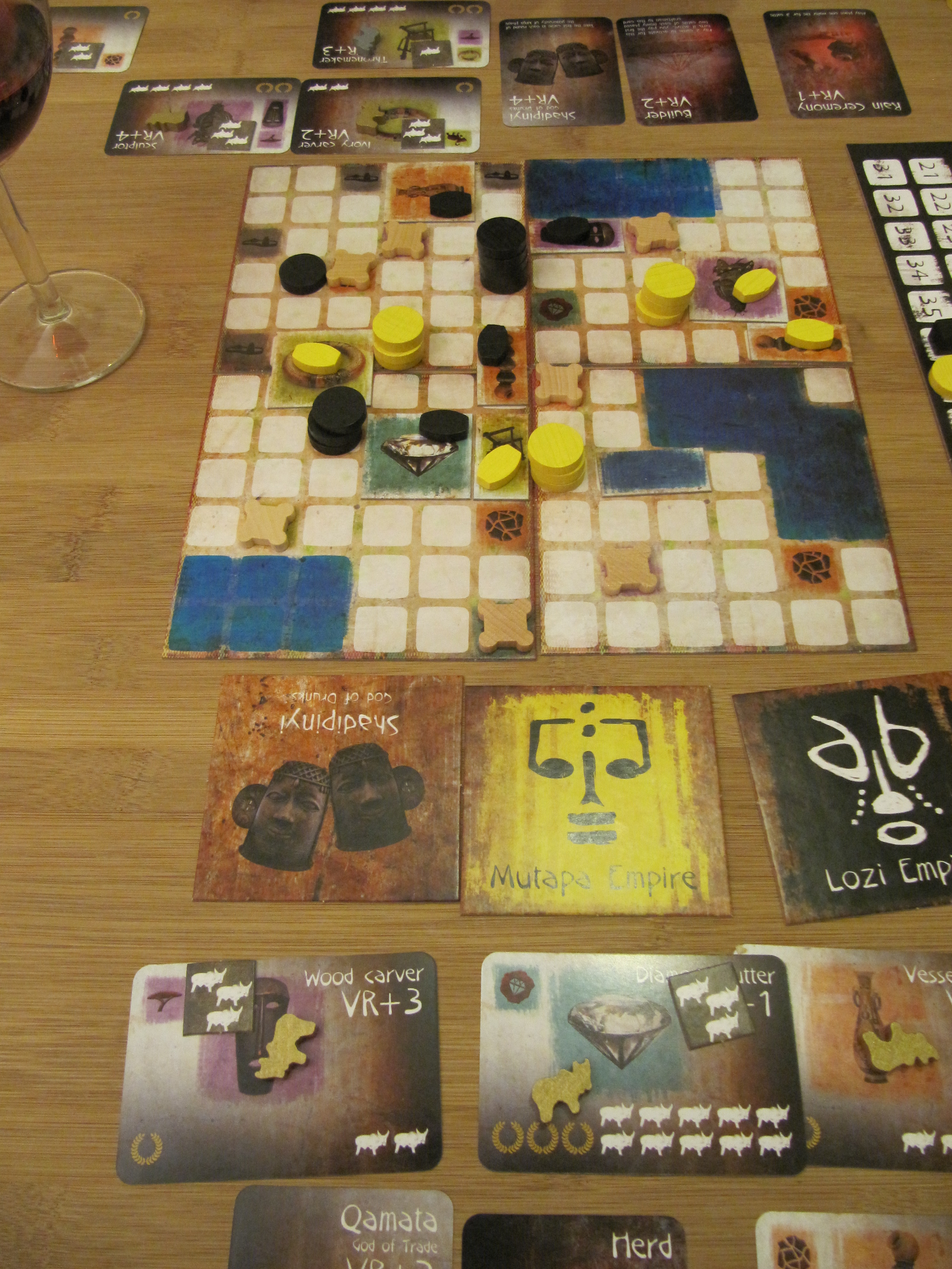 C’est le seul mais grand reproche que je ferais à The Great Zimbabwe. Le jeu est long (plus de 2 heures à 2 joueurs) et une bonne partie de son temps on calcule mentalement pour savoir si telle ou telle action est possible ou non, intéressante ou non. C’est dommage et à la fin ça en devient ridicule. Exemple qui m’est arrivé: J’ai 39 bétails et en ait déjà dépensé 10 dans les enchères. J’hésite à passer ou à surenchérir. Je veux absolument être premier joueur pour pouvoir disposer de toutes les ressources disponibles pour pouvoir surélever mon bâtiment de 3 à 4 étages et j’aimerais aussi en profiter pour augmenter l’autre de 1 à 2 étages. Donc, il me reste 39 bétails et j’en ai déjà dépenser 10. Pour être sûr d’être premier joueur je dois miser 18 bétails. Je récupérerai alors 6 bétails. Ce qui fait qu’il m’en restera … donc … 39 – 18 + 6 = 27. 27 est-il suffisant pour surélever mon bâtiment? J’ai donc besoin de 4 objets culturels différents. Le premier est à portée et me coûte 3. Les 3 autres sont fournis par des artisans secondaire. Le premier est à portée via 2 relais. Le prix de l’objet secondaire est de 2 bétails et le prix de l’objet primaire est de 3 bétails en passant également par un relai. Le prix du 2ème objet est donc de 2 pour le secondaire + 3 pour le primaire + 1 par relais soit 3 au total car 3 relais utilisés. Au total, ce deuxième objet culturel m’aura coûté 8 bétails à déduire de ce que j’avais. Oui mais, il me restait encore combien? Bon je recompte: 39-18+6= 27 -3 pour le premier objet et – 8 pour le second, il me reste donc 16 bétails pour acheter les 2 derniers objets. Et c’est reparti pour les calculs fastidieux pour savoir si oui ou non je décide d’enchérir plus… Et je vous dis pas le nombre de fois où on se trompe dans les calculs ou où on n’a pas remarqué qu’il nous restait 3 bétails supplémentaires qu’on n’avait pas remarqués car ils étaient posés sur une carte et que la différence de couleur ne sautait pas aux yeux. Bref de nombreux calculs mentaux qui n’apportent rien au jeu à l’exception d’un ralentissement considérable des parties et d’une certaine lassitude en fin de partie.