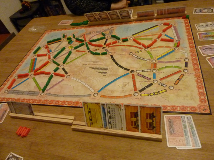 Les Aventuriers du Rail: Asie est une extension et exige évidemment une boîte de la version USA ou Europe. Cette extension par équipe renouvelle vraiment bien ce classique des jeux de société. La plus grosse critique qu’on retrouve sur les Aventuriers du Rail est la grande part de hasard dans la pioche des cartes. En équipe, ce hasard est encore présent mais peut être atténué justement par le partage de cartes avec son partenaire de jeu. Comme on le voit sur la photo ci-dessous, on constate deux présentoirs de cartes par équipe. Un pour les objectifs et un autres pour les cartes wagons. Les deux joueurs d’une même équipe peuvent donc utiliser les cartes wagons du présentoir comme si elles étaient dans leur main et peuvent remplir les objectifs présents sur l’autre présentoir.