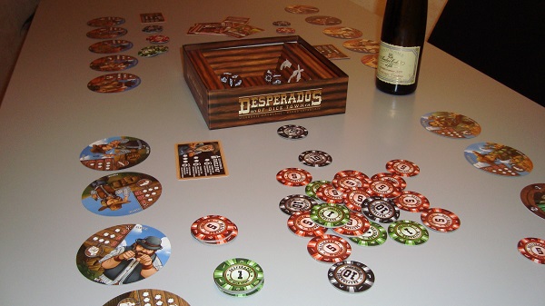 La partie débute alors. On lance chacun son tour 4 dés dans la boîte qui sert intelligemment de « piste » à dés. Chaque face désigne un de vos desperados (soit 5 faces), la sixième représente une face « action ». Le but sera de combiner des résultats « action » avec des résultats « desperados » pour les faire agir. On a droit à 3 lancers…