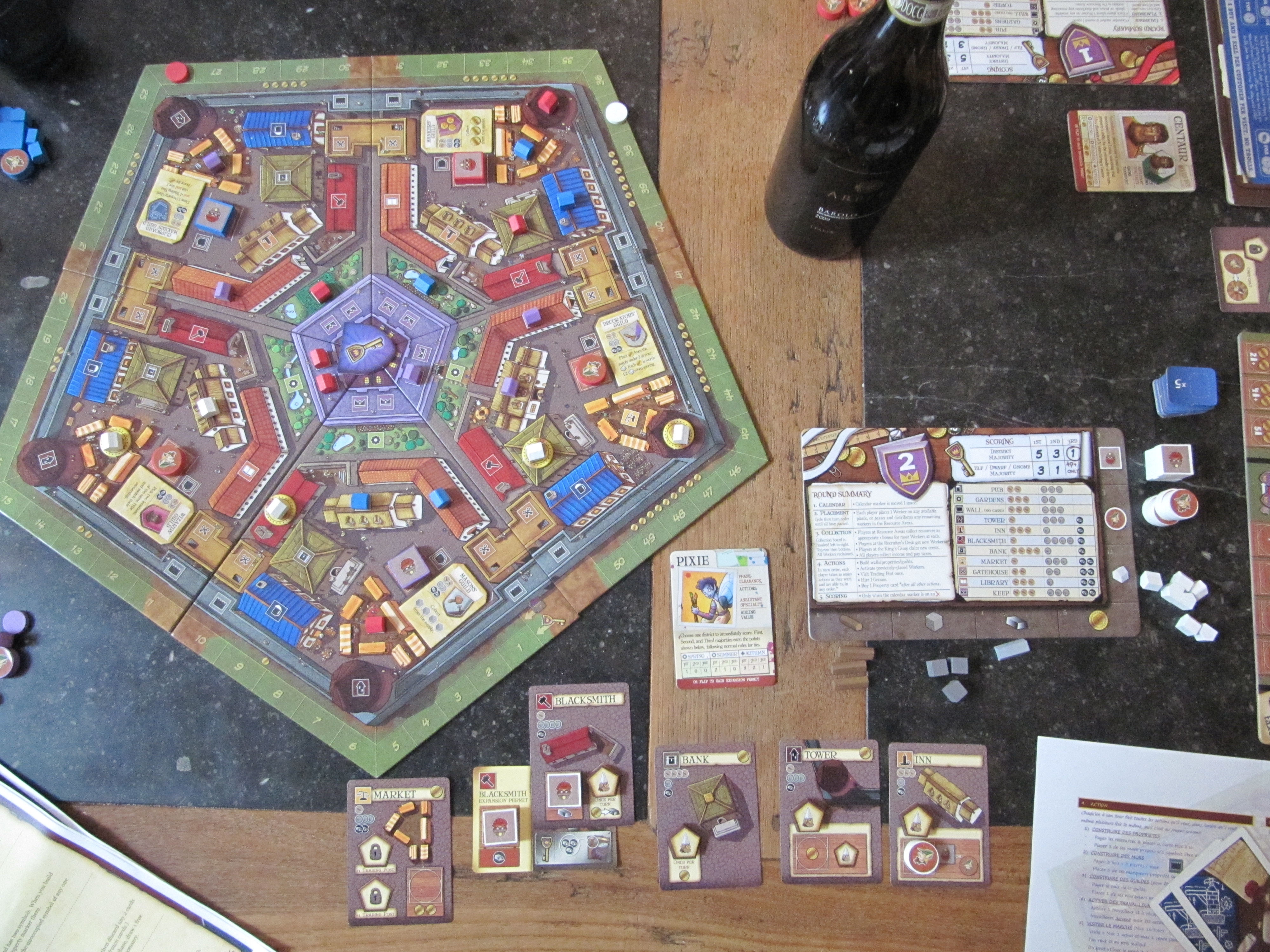 Comment c’est-y qu’on marque des points? 3 fois sur la partie (à la fin de 3 des 7 tours de jeu, incluant bien sûr le tour final) on effectue plusieurs décomptes: celui qui a la majorité dans chaque quartier (bâtiments, murs et guildes comptent) gagne des points (de même que le 2ème, mais moins, ha ha vous ne vous y attendiez pas à celle-là hein!). Et celui qui a la majorité dans chaque groupe linguistique… heu non sorry, dans chaque type de travailleur (nain, elfe, gnome) gagne des points. A la fin celui qui a le plus de points a gagné.