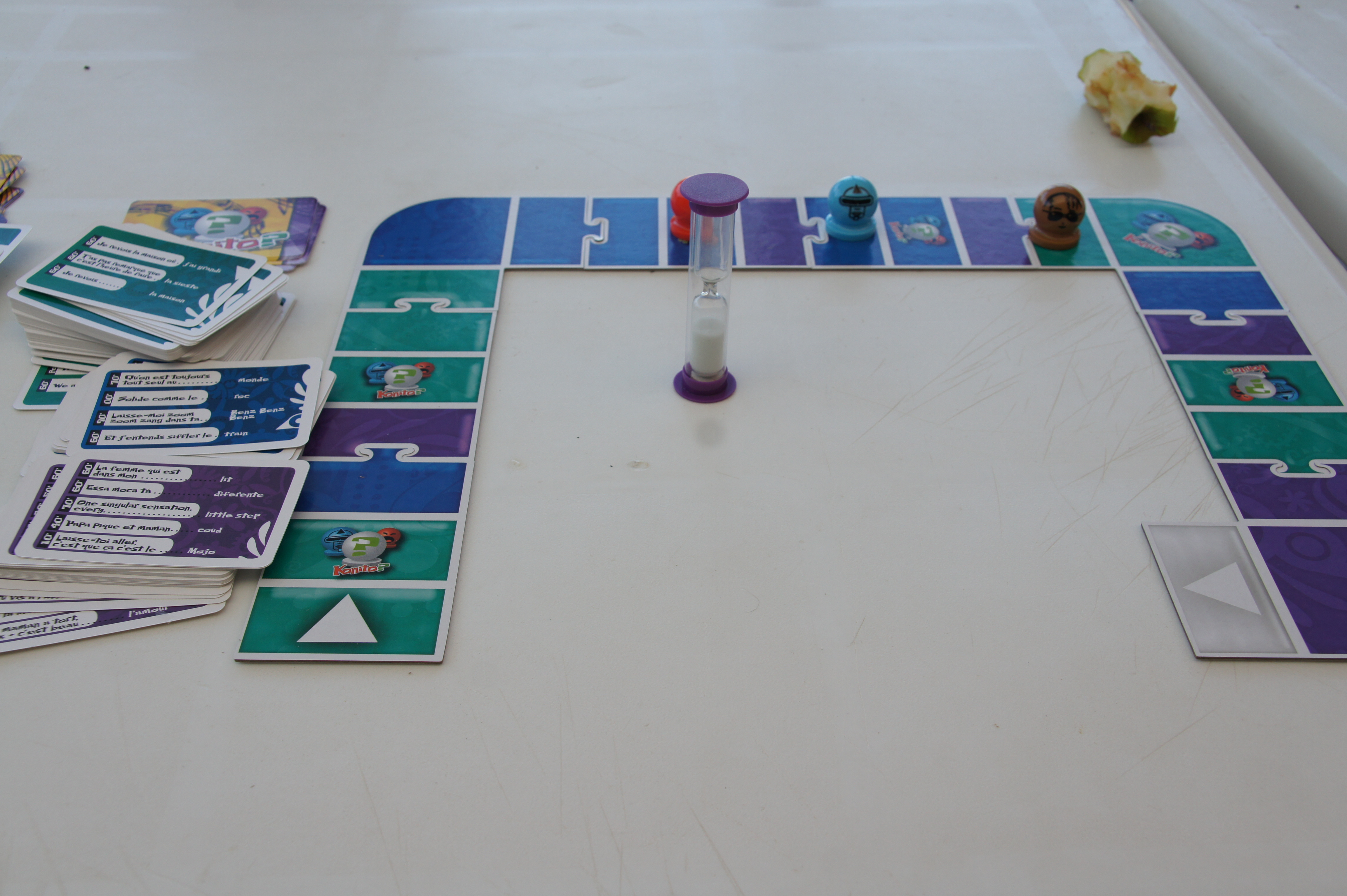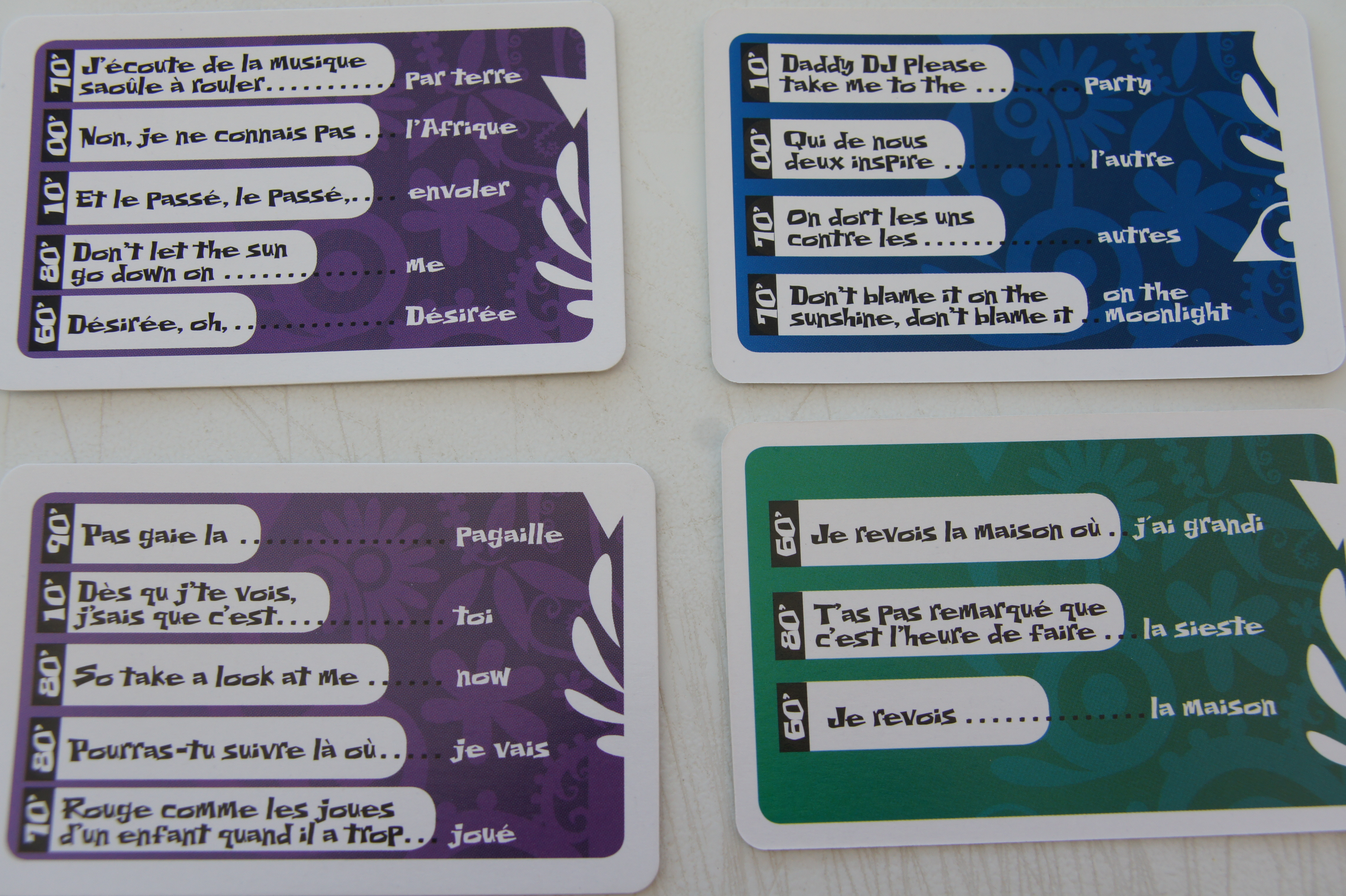 Un peu comme dans Time’s Up ou dans Taboo, dans Konito? Musik, vous allez devoir faire deviner un maximum de mots écris sur des cartes. En fonction des cartes, vous allez devoir faire deviner entre 3 et 5 mots par carte et chaque carte correspond à 1 point. En un sablier, vous allez donc devoir faire deviner un maximum de mots de plusieurs cartes pour pouvoir gagner plusieurs points. La particularité et le fun de Konito? Musik est que ces mots à faire deviner font toujours partie d’une phrase extraite d’une chanson, et l’idéal est de chanter cette phrase pour faire deviner le mot en question. Ca donne des moments délicieux ou chacun chante à sa façon des chansons connues. En effet, ce qui m’a frappé dans Konito? Musik est qu’ils ont réussi à trouver des phrases de chansons que tout le monde connaît. Il est en effet assez rare qu’on ne connaisse pas la chanson. Et dans ce cas, on peut faire deviner le mot en question autrement: par des mimes ou par la parole. Ca prend légèrement plus de temps mais ça permet d’être toujours à bord même si on ne connaît aucune chanson.