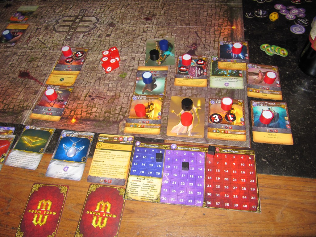 2) Il y a un plateau et il n’est pas anodin. En effet, les créatures et le magicien se déplacent sur ce plateau, peuvent invoquer des murs pour bloquer les déplacements ou la ligne de vue, peuvent attaquer à distance,… C’est un réel plus par rapport à Magic car on visualise beaucoup plus ce qu’on fait, on est plus immergé dans le thème et surtout, cela offre de nouveaux choix tactiques et stratégiques. Magnifique !