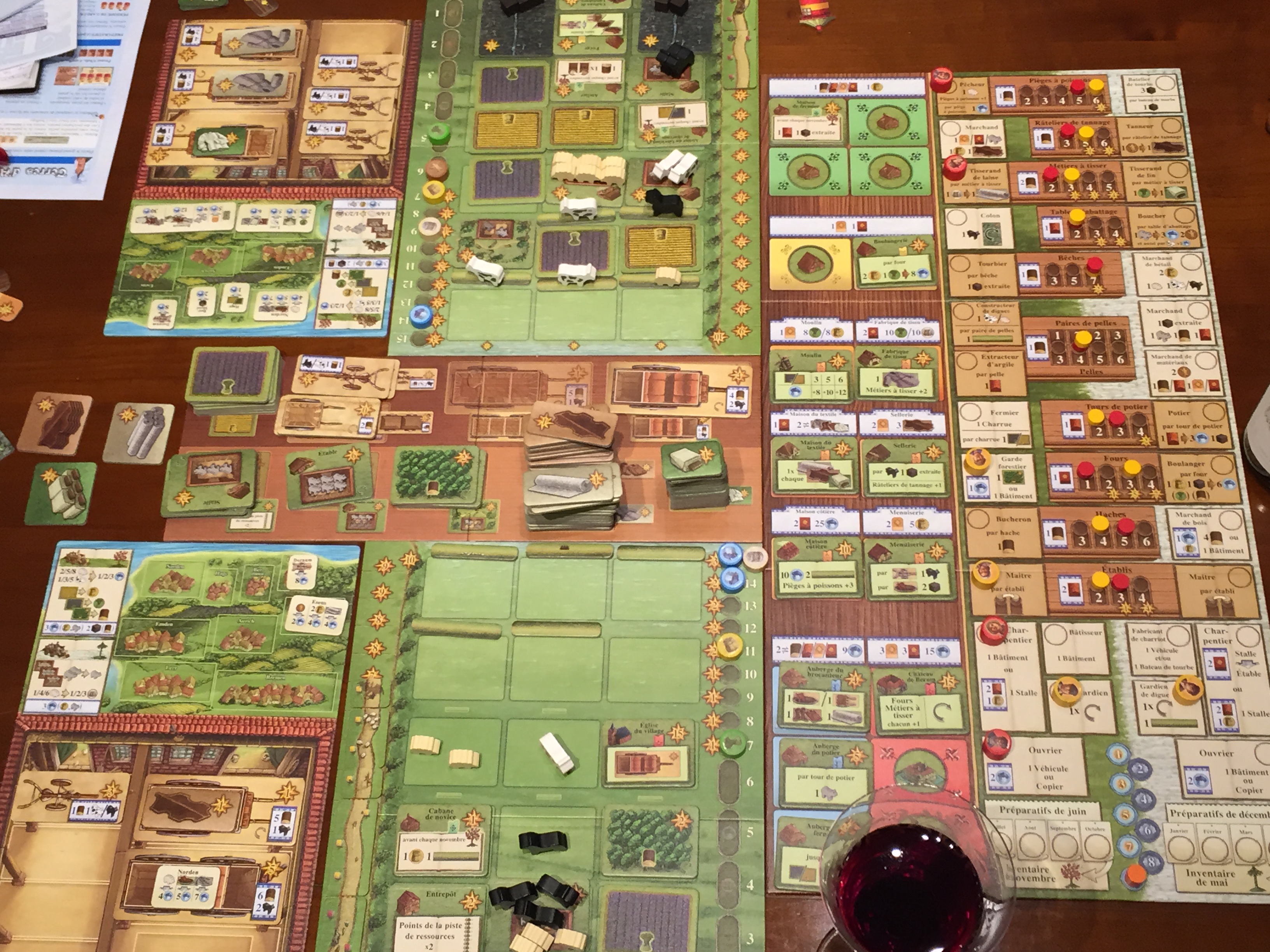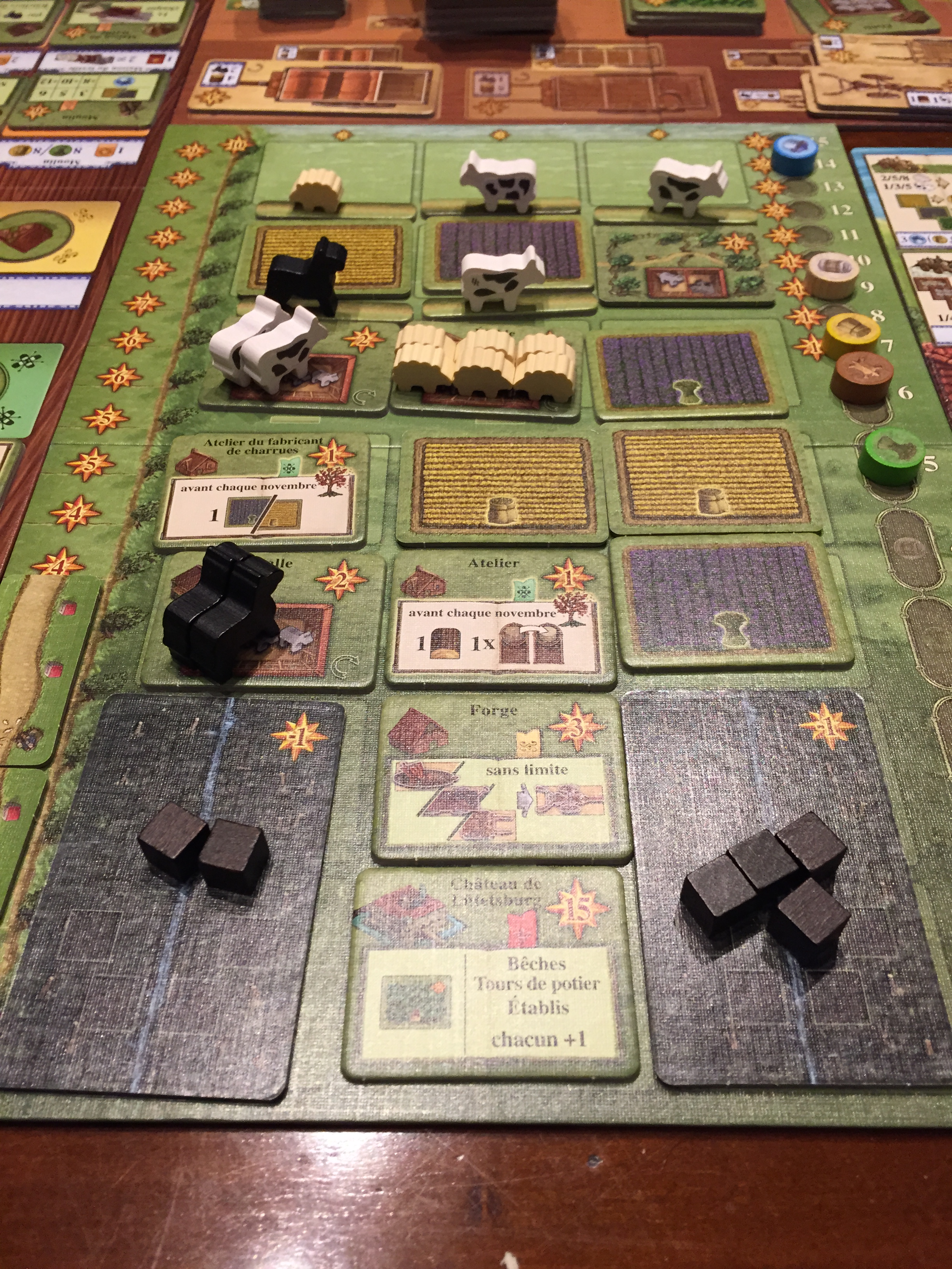 Last but not least l’interaction, certes totalement indirecte, est bien présente. Il n’y a jamais moyen de prendre l’unique action de la mort qui tue qui allait faire gagner 243 points ha la la pas de chance l’autre l’a prise avant vous. Mais il y a (largement) moyen de gêner l’autre, de le freiner, de le contrarier… et c’est très vivement conseillé! Il faut donc suivre constamment ce que fait l’autre, et de temps en temps, au bon moment, choisir astucieusement l’action qui va l’embêter tout en rentrant parfaitement dans votre stratégie. L’interaction est également présente dans la course aux bâtiments (qui sont tous uniques) et, certes beaucoup plus rarement, dans la disponibilité de certains éléments du jeu (il peut arriver qu’on tombe à court de stalles par exemple, ou à court de champs).