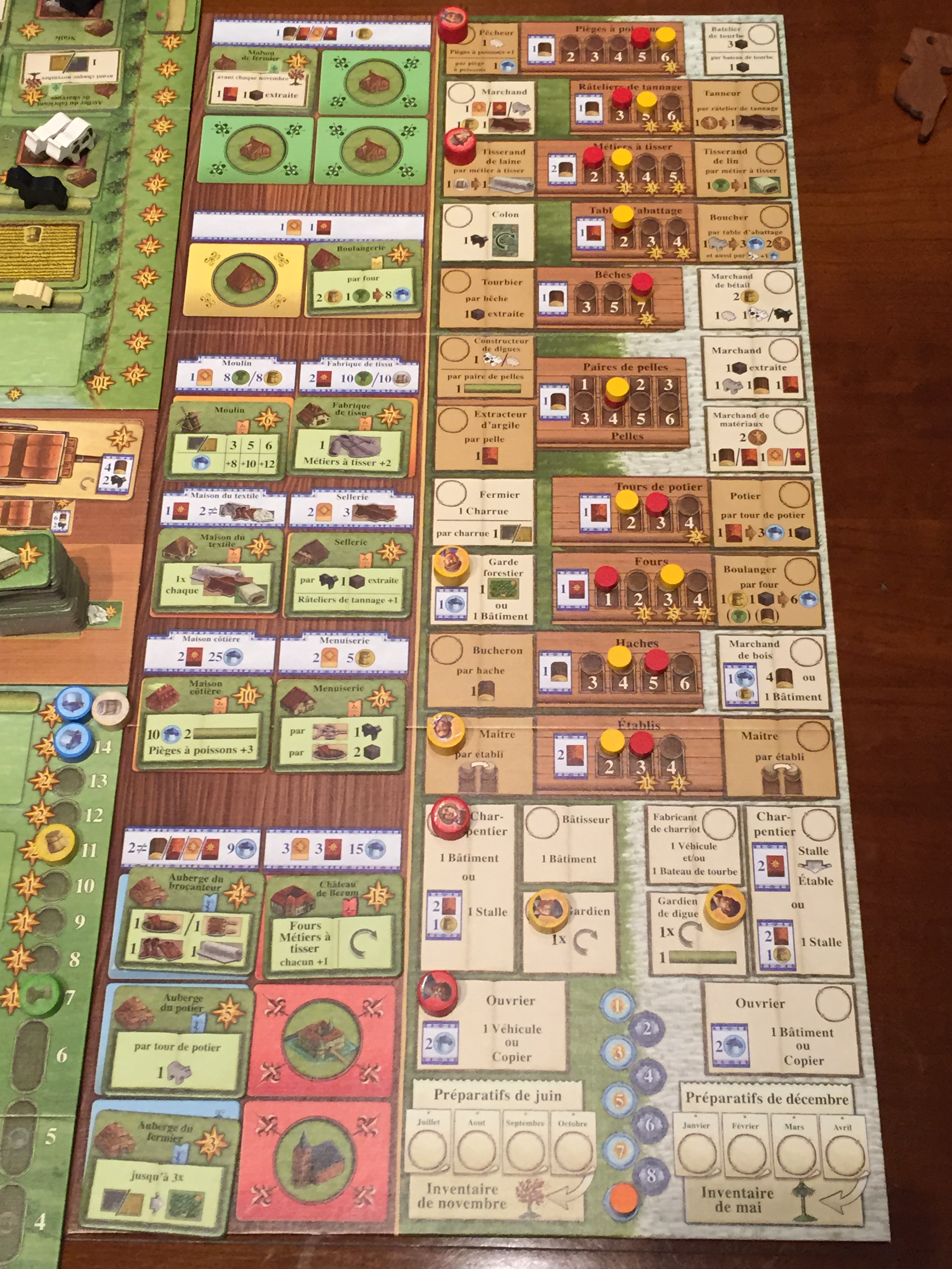 Cette fois, nous y avons joué sans les bâtiments de départ conseillés pour les premières parties.  Et bien, ça change tout !  Avec ces bâtiments, les joueurs recevaient des sortes de revenus un tour sur 2.  Maintenant, tout ça c’est terminé et les effets très intéressants ont été remplacés par des effets « bof bof ».  Ceci rend Terres d’Arle encore plus difficile.  Les contraintes de nourriture, de tourbe, de place sur votre plateau personnel sont encore plus difficiles à respecter et on se concentre essentiellement, durant plus de la moitié du jeu, à les satisfaire.  D’un côté, c’est un peu dommage tant le jeu nous oblige à réaliser certaines actions, de l’autre, c’est assez inédit de ne pouvoir développer que très peu ses stratégies.  Les choix en deviennent encore plus cruciaux et le combat entre joueurs encore plus intense.  Si vous vous axez vers une stratégie « peaux » par exemple et que votre adversaire vient vous piquer l’action récolte de peaux et le bâtiment coutant 3 peaux, ça peut faire mal même si cela ne va pas dans la stratégie de votre adversaire.  Couper l’herbe sous le pied de l’autre devient une stratégie en soi ! 😉