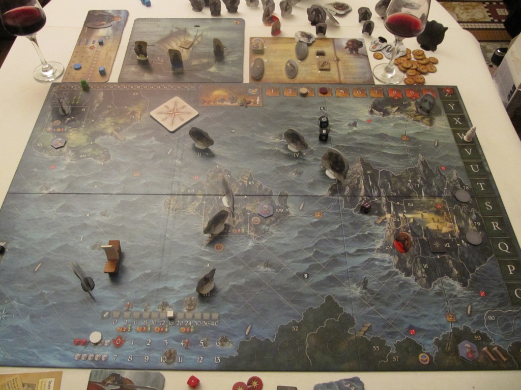 Les règles de l’extension indiquent un site sur lequel on peut télécharger gratuitement la bande-son du jeu.  Bon, ce n’est pas le premier jeu avec une bande-son (Space Alert (le Vin909 Andor 2 d’jeu d’l’année 2010), Escape, Zombie 15’,…), mais à ma connaissance, le premier jeu avec une bande-son dont la seule utilité est de créer une ambiance.  D’ailleurs, aucun CD n’est fourni avec le jeu, c’est juste un « bonus » de plus d’une heure de musique instrumentale sur un fond de vagues et de vent.  C’est vraiment génial comme idée tant cela nous immerge encore plus dans le jeu et son thème.