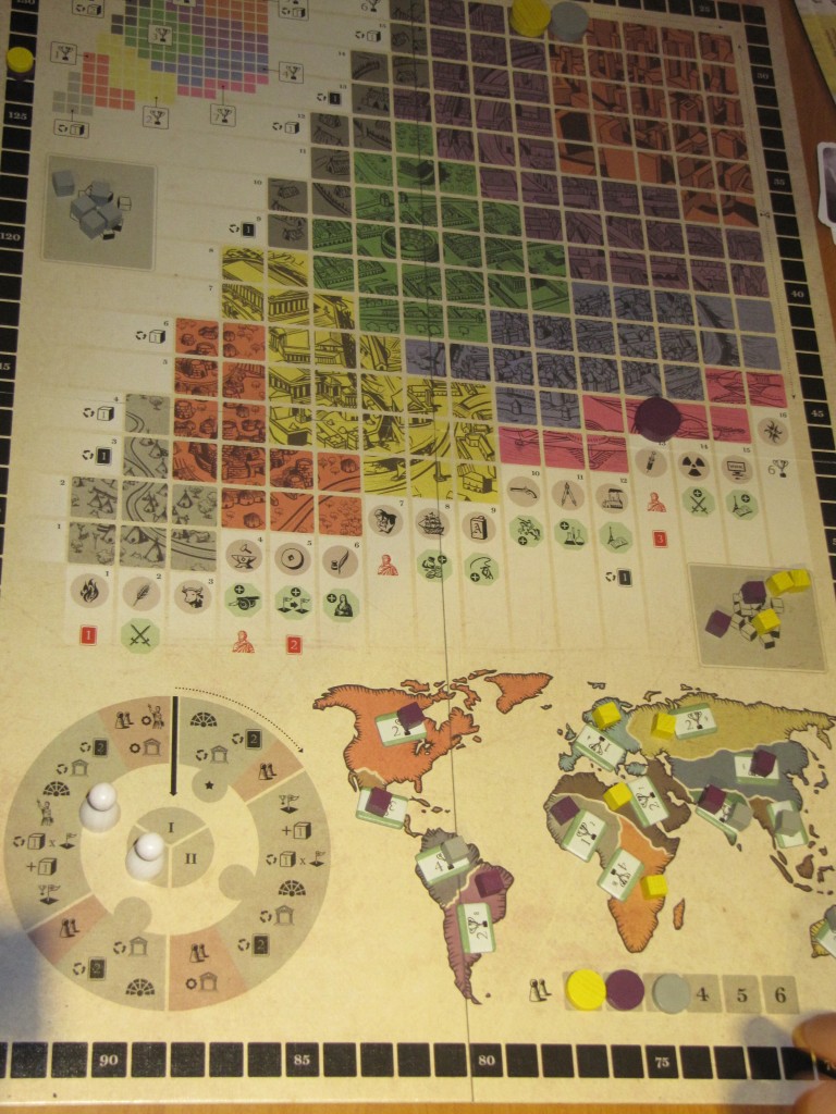 Si vous regardez le plateau, vous voyez une sorte de tableau excel sur lequel évolue un pion de chaque joueur. Au début du jeu, ils sont tous empilés sur la case du bas à gauche. Au plus votre pion se déplace vers la droite, au plus son niveau technologique augmente. Au plus votre pion se déplace vers le haut, au plus vous progressez sur l’échelle militaire.