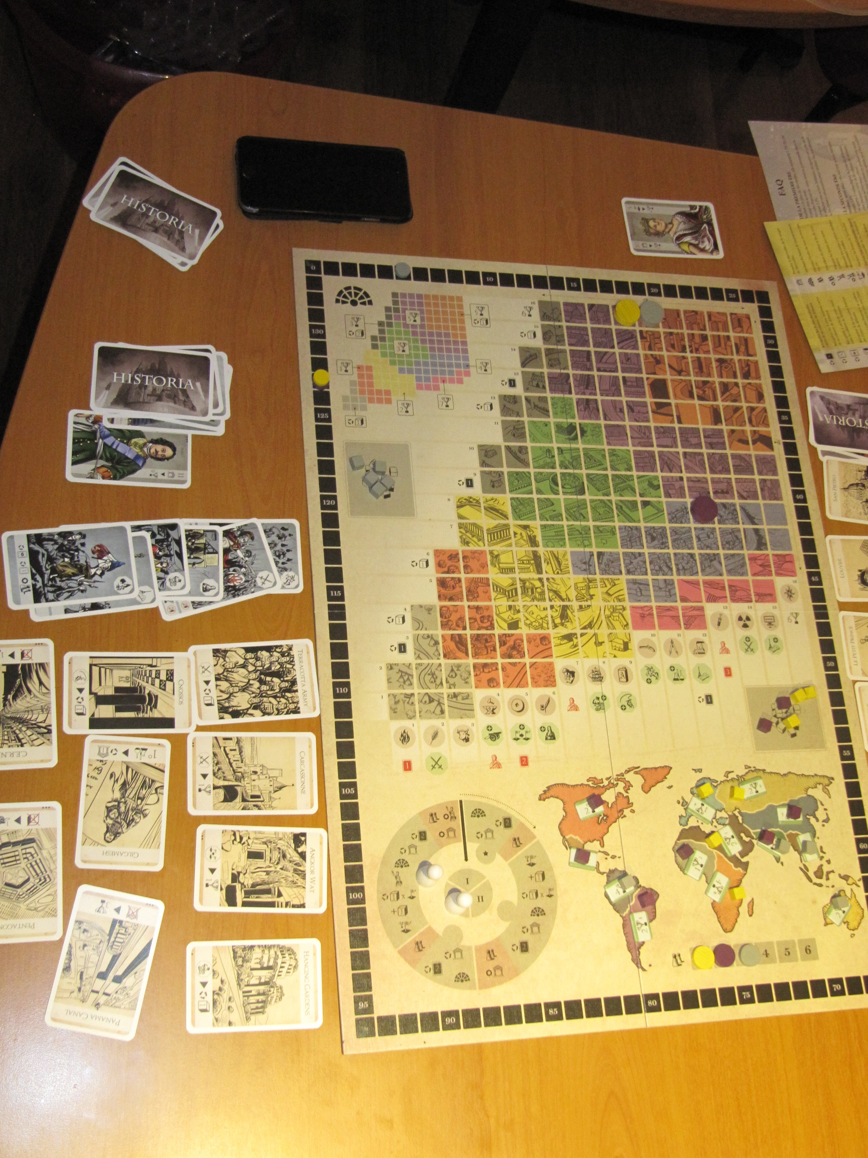 Historia est un jeu de civilisation qui séduit. L’absence d’aléatoire en fait un jeu légèrement froid mais extrêmement bien abouti et réfléchi. Il est long mais on ne voit pas le temps passer. Il est dommage de voir qu’une nouvelle fois, l’aspect militaire est plus important que les autres et qu’il va bien souvent conditionner la victoire obligeant par là-même les joueurs à se développer à outrance dans cet aspect. A noter que la variante « Civbots » permet d’amoindrir cette suprématie. Malgré ça, les choix sont succulents et la vue long terme nécessaire et curiale. Les cartes apportent de la variété au jeu mais sont tellement bien équilibrées que le jeu risque d’avoir une durée de vie plus limitée que celle des autres jeux de civilisation. Historia n’est pas simple sans être pour autant compliqué et une fois les règles assimilées, le jeu en lui-même est assez facile grâce notamment à une multitude d’icônes dans tous les sens compliquant légèrement les choses mais rappelant surtout les différents éléments de règle. La gestion de l’unique ressource ainsi que de ses cartes action est succulente et en font un très bon jeu de civilisation indispensable pour tout amateur du genre.