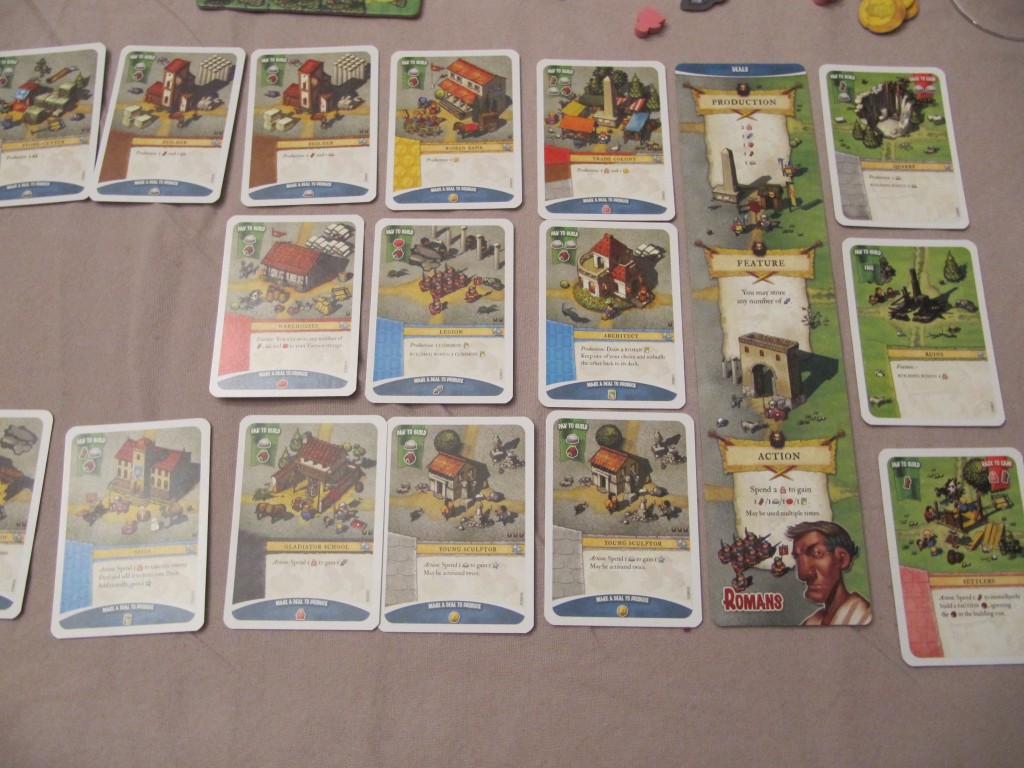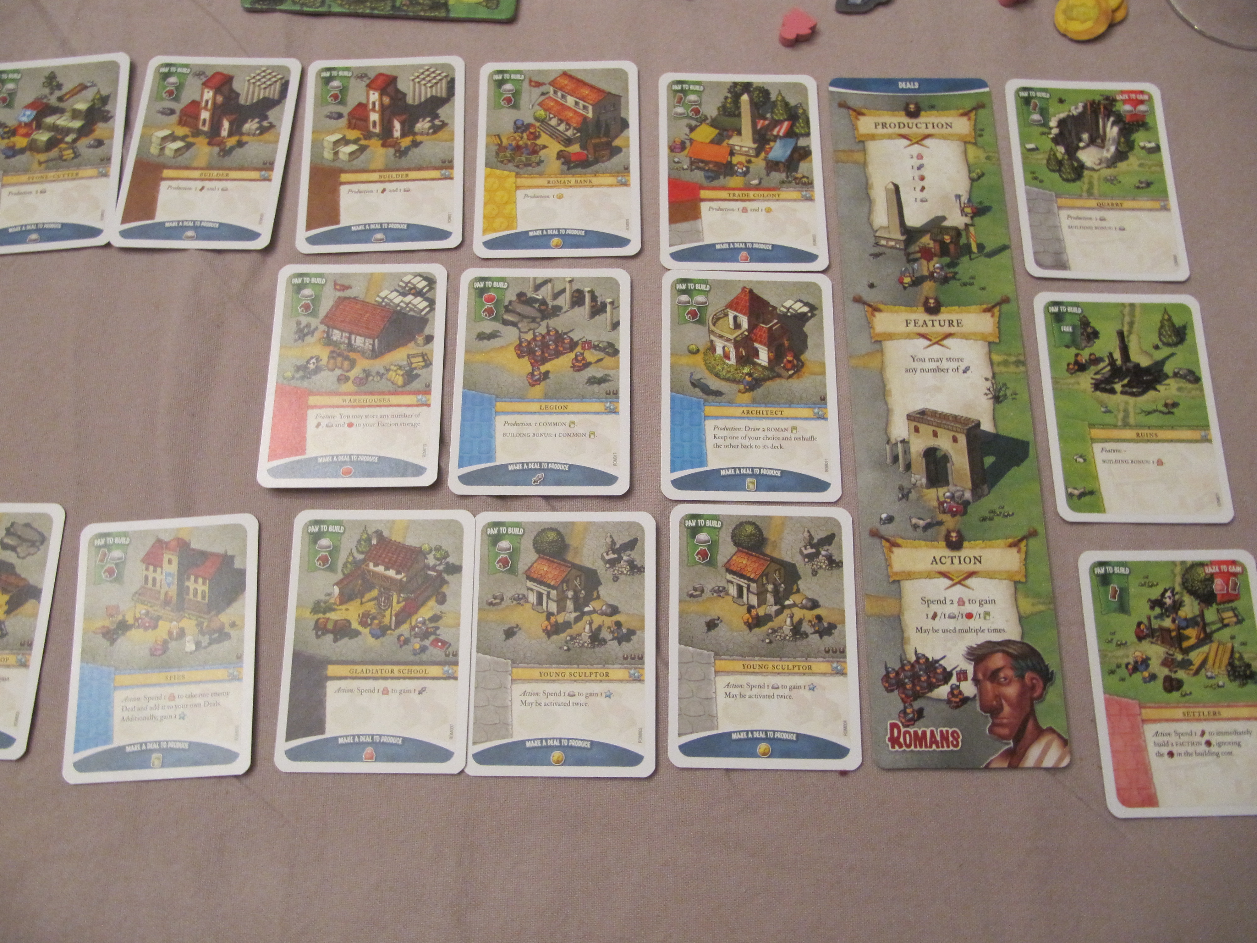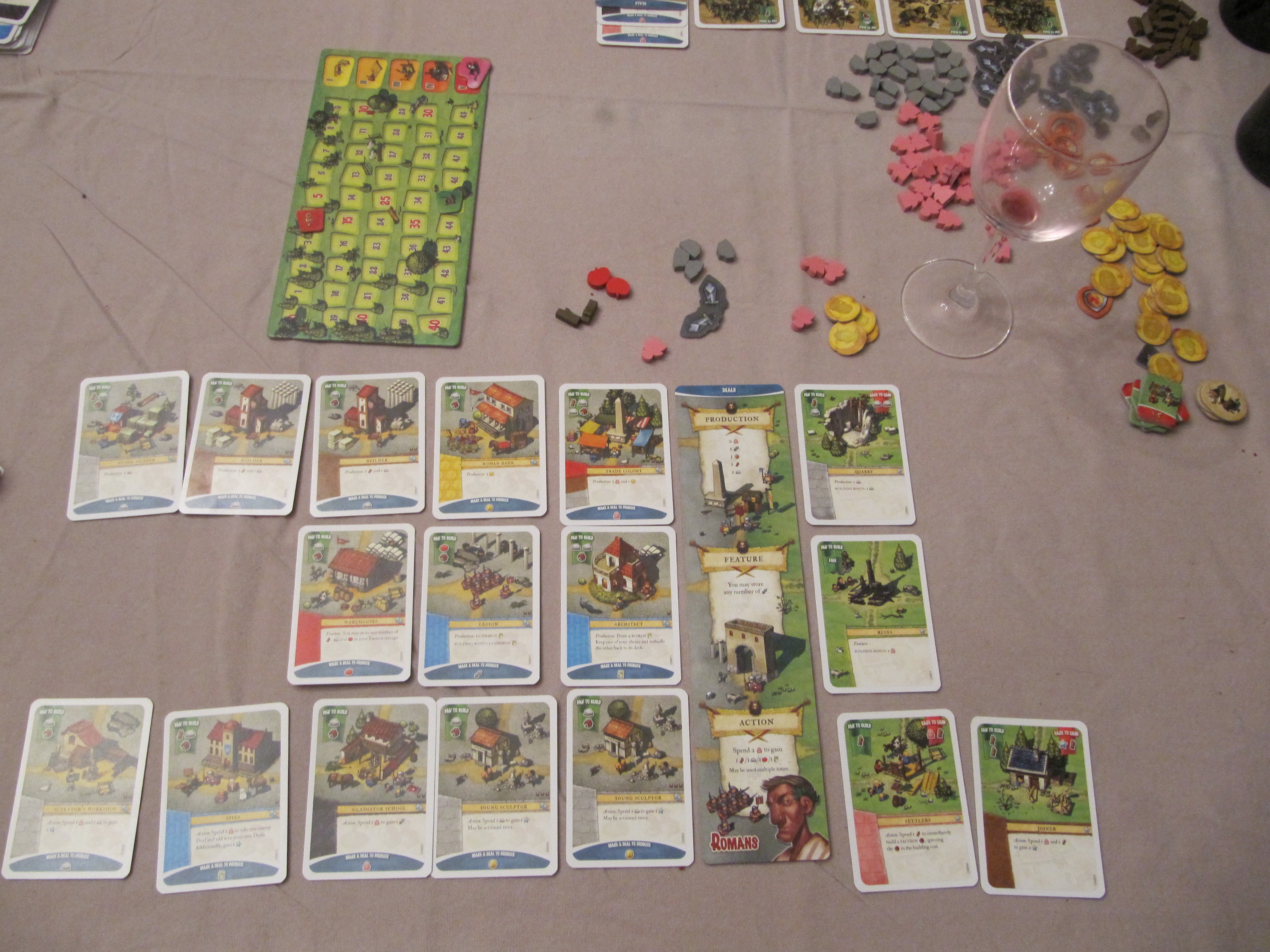 La partie s’emballe … mon adversaire marque des points, beaucoup de points, à chaque tour. Ses cartes de romains se combinent très très bien. Ok, je dois sûrement pouvoir faire la même chose avec mes barbares. Sûrement, je croule sous les ouvriers, et je sens bien que les cartes me poussent à faire l’action ‘Raze’ bien plus que mon adversaire. Allez essaie. Allez, ca doit être possible…. ou pas.