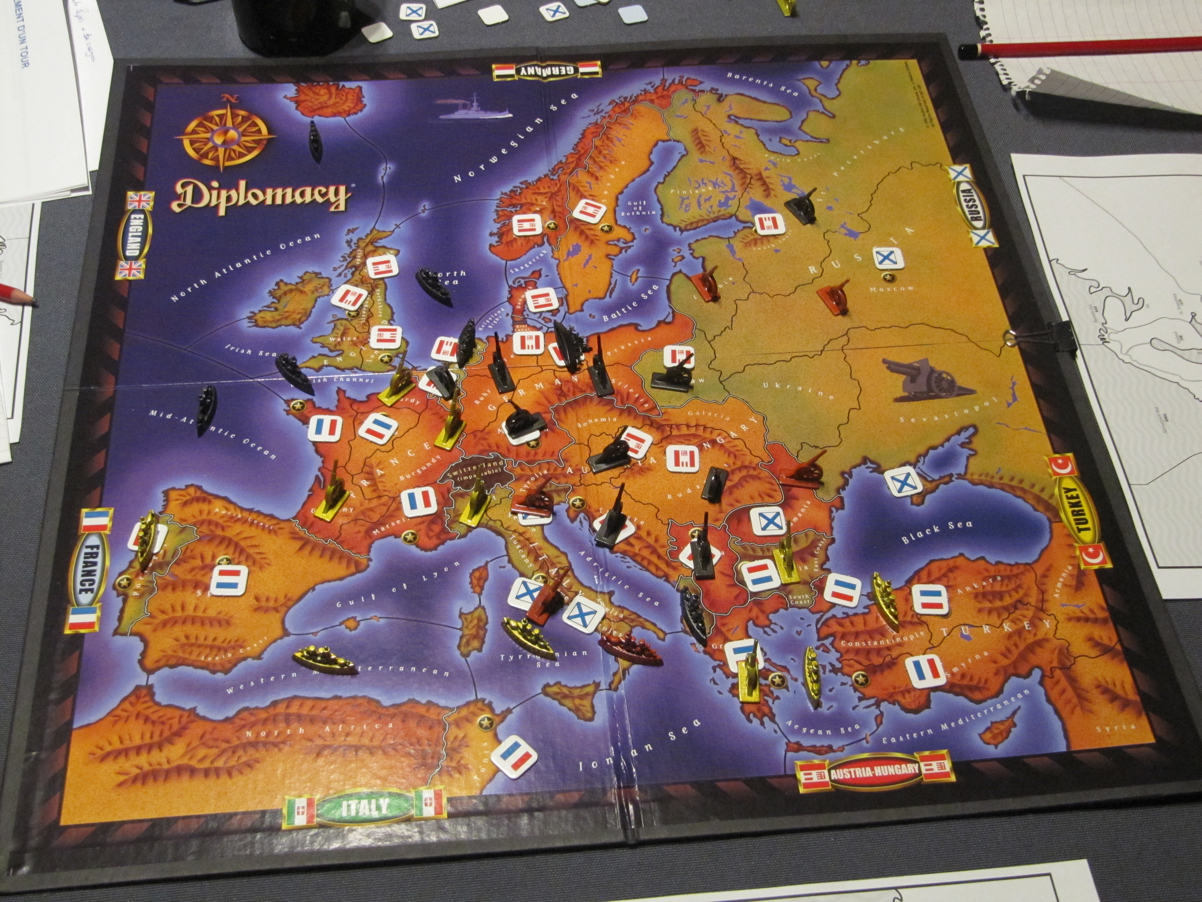 Première partie pour ma part à Diplomacy. Je suis toujours un petit peu sceptique quand on envisage des jeux plus anciens… Je crains toujours une part de hasard trop importante, l’absence de choix intéressant ou une mécanique trop répétitive.