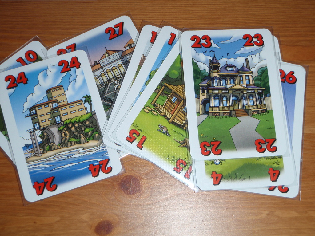 Les joueurs vont enchérir pour les 30 buildings dont la valeur varie de 1 à 30. On va mettre aux enchères un nombre de buildings équivalent au nombre de joueurs. Dès qu’un joueur abandonne les enchères, il reçoit le building restant de la valeur la plus petite. Le dernier joueur à rester reçoit le plus cher. Ce système donne un léger avantage au joueur ayant remporté l’enchère car il la remporte d’un seul cran par rapport au second. Et on va faire ça pour chaque carte du paquet building.