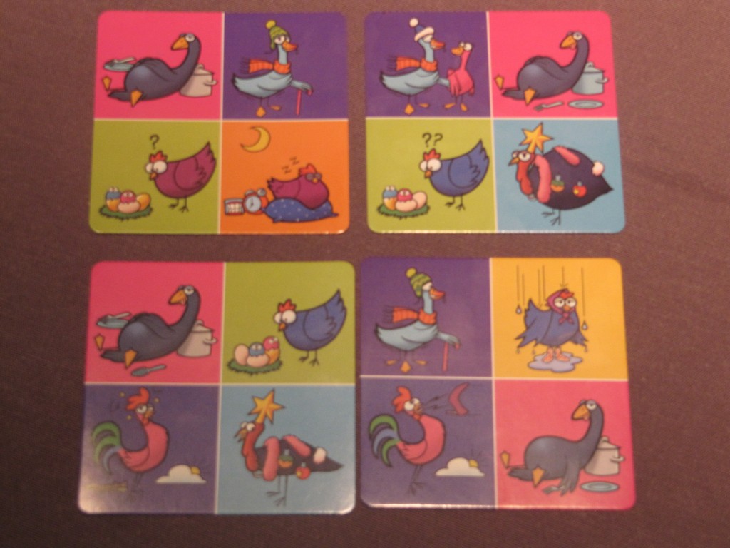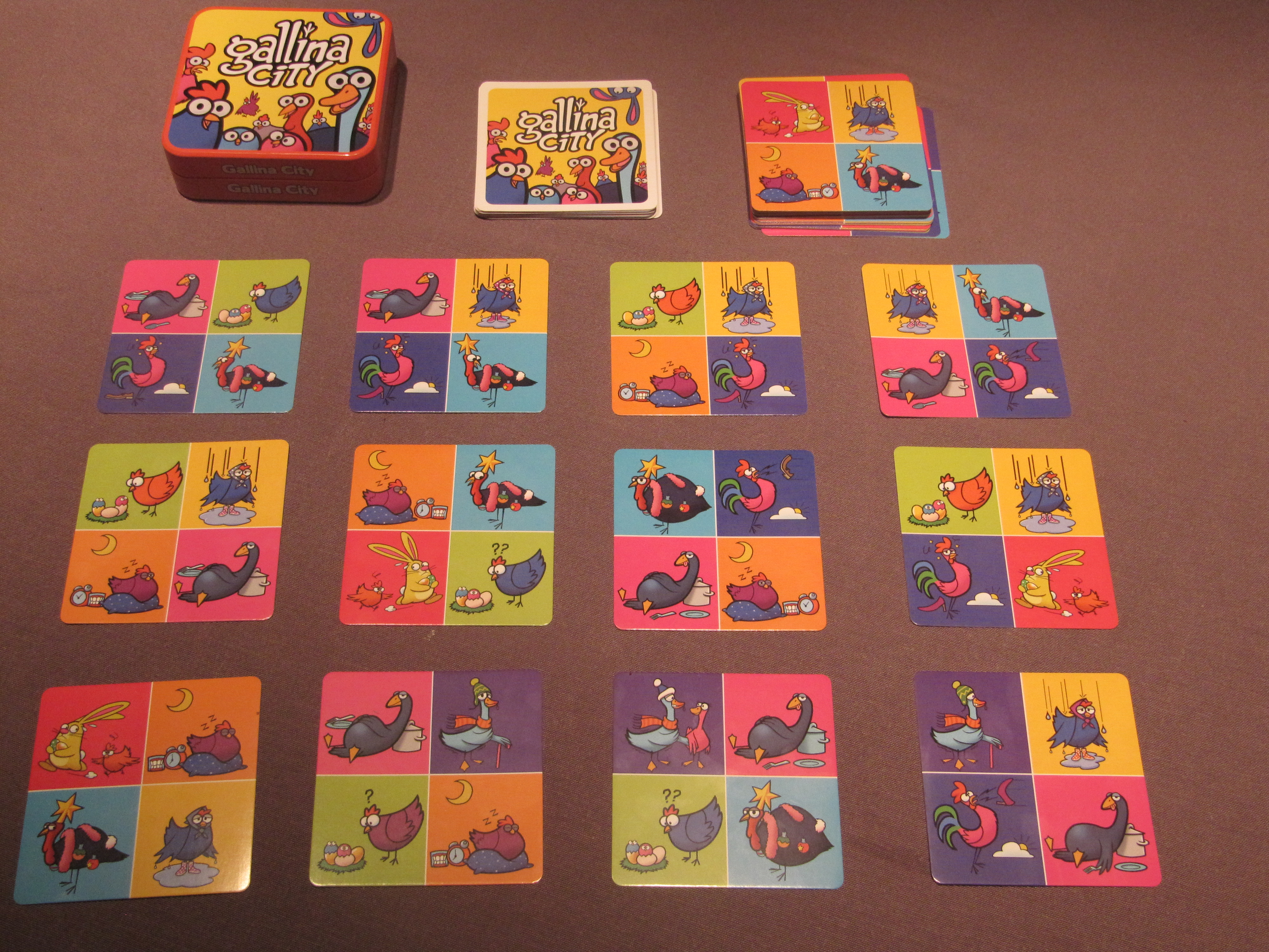 Gallina City est un jeu très simple et amusant.  Les joueurs ont 8 cartes en main.  Sur chaque carte sont représentés 4 dessins de gallinacés.  Le but est de discuter, tous en même temps 🙂 , avec les autres joueurs pour trouver les dessins les mêmes.  Dès que 2 joueurs, uniquement sur base de leurs discussions, pensent avoir la même image, ils la montrent aux autres joueurs.  Si c’est la même image, ils défaussent chacun cette carte, sinon, ils en piochent une autre.  Le premier à n’avoir plus que 2 cartes en main emporte la manche et les autres joueurs perdent autant de points qu’il ne leur reste de cartes.