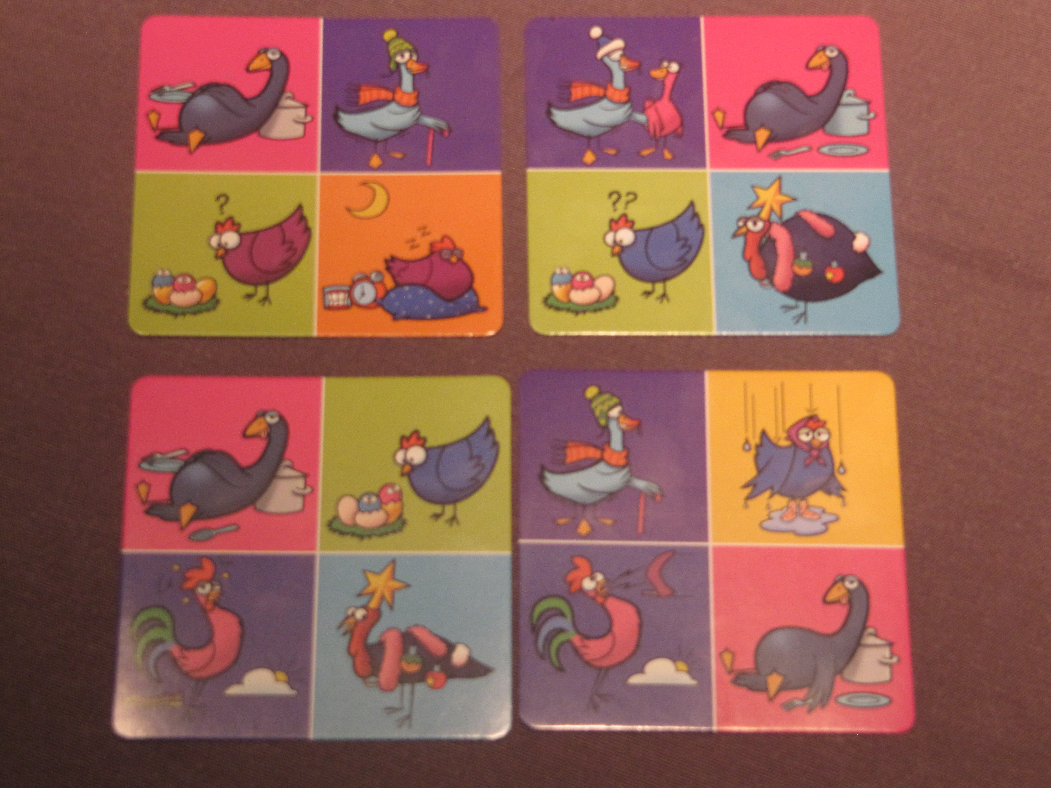 Le truc très comique, et je vous encourage à bien regarder les photos de cet article pour vous en rendre compte, c’est que les dessins se ressemblent fort mais divergent bien souvent par de petits détails : la fourchette près de la poule mauve avec une étoile sur la tête est à droite de l’image et à gauche de l’image pour l’autre, la couleur d’un œuf de la poule rose est différente, les oreilles du lapin sont croisées sur une image et sur l’autre pas, le bonnet du canard a un pompon ou pas, les bottes de la poule ont des points blancs ou pas, la poule ferme les yeux alors qu’ils sont ouverts sur l’autre,…  Toutes ces menues différences obligent les joueurs à bien décrire minutieusement leurs images.  Et c’est très sympa car je m’attendais à un jeu « joyeuse cacophonie » ou tout le monde crierait « qui a une poule 1138 Gallina 2mauve ? » « moi ! », ok carte défaussée. Ici on est dans le plus subtil : « qui a une poule mauve ? » « moi » « comment est-elle ? » « a-t-elle une écharpe? »  « de quelle couleur est la chaussure ? » « son bec est-il ouvert ou fermé ? »,…