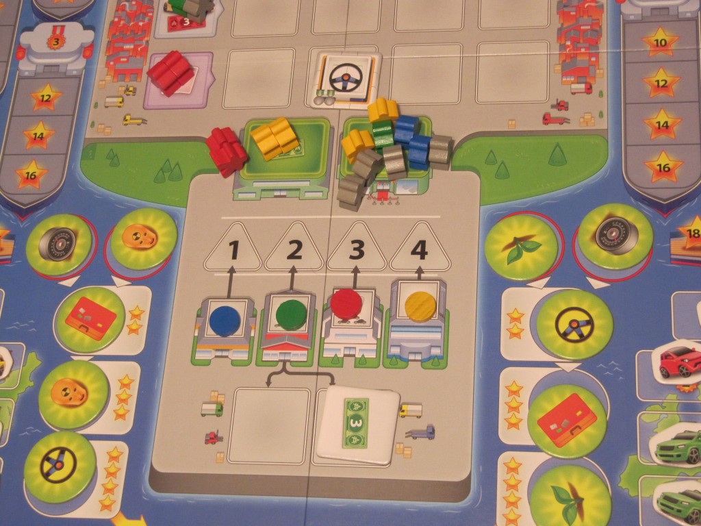 Une fois votre (ou vos) ouvrier placé, vous pouvez prendre une des tuiles de la colonne ou de la rangée et la placer sur votre chaine de production. En plus de la récupération de ses ouvriers, le second aspect génial de cette mécanique de placement d’ouvriers est que, en fonction de la ligne ou de la colonne où vous aurez placé votre ouvrier, vous allez devoir payer et produire un des 3 types de véhicules. Autrement dit, le placement de votre ouvrier va avoir 5 conséquences: