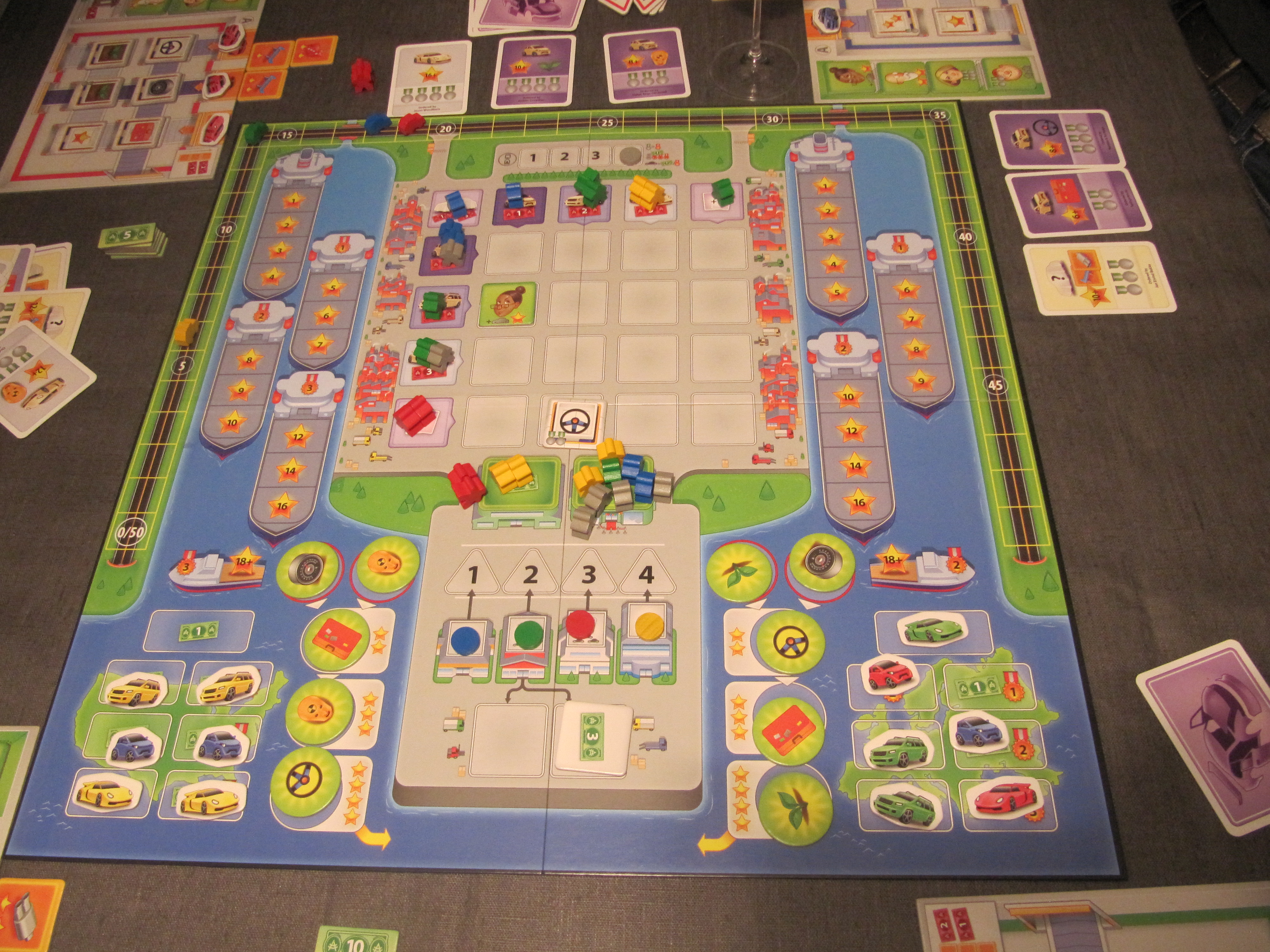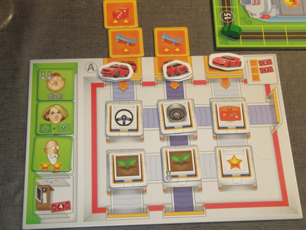 Pour mieux suivre, regardez la photo ci-contre à droite en même temps que vous lisez cet excellent article 😉 Lors du placement de votre ouvrier, je vous rappelle que vous décidez aussi quelle voiture va être produite. Votre plateau personnel vous montre vos 3 chaines de production (légèrement inspirées du magnifique Kanban, un de nos coups de cœur de cette année). Chaque chaine de production correspond à un de vos 3 types de véhicules: les citadines, les 4×4 et les sportives. Et les chaines de production se croisent de telle sorte que certains éléments seront produits dans différents types de véhicules. Si je reprends la photo sur la droite, vous voyez que la jeep produite aura une super tenue de route, une grande puissance et un grand coffre. La citadine aura aussi un très grande puissance et sera écologique. Donc, les tuiles acquises vont être placées sur les chaines de production et donneront des attributs aux voitures que vous produirez.