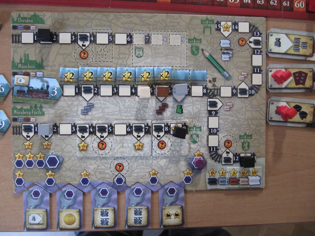 – La plus belle nouveauté est la possibilité de choisir les bonus de sa ligne.  En effet, 3 portions de ligne sont vides.  Lorsqu’on avance son rail noir sur une de ces portions, on doit choisir et prendre, parmi les tuiles portion encore disponibles, celle qu’on va placer sur sa ligne et sur laquelle on va profiter des bonus.  C’est bien vu car, non seulement ça apporte des choix supplémentaires, mais ça apporte également une nouvelle course entre les joueurs qui veulent pouvoir construire une portion spécifique.  Très chouette.