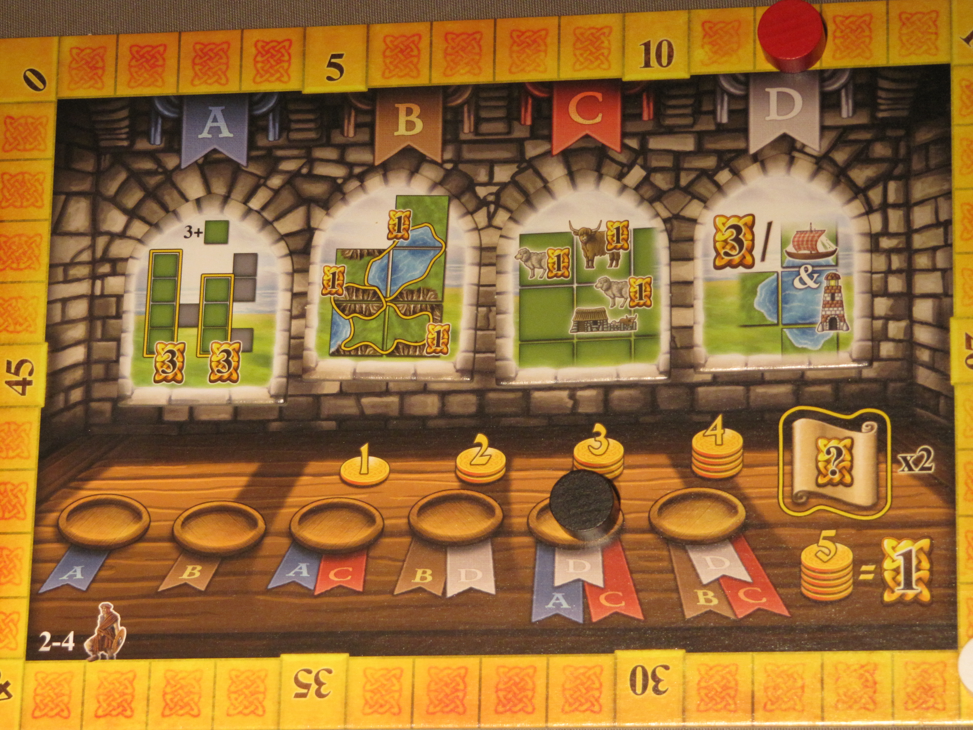 Isle of Skye est bien fait et ses tuiles sont assez bien équilibrées. Il arrivera donc assez fréquemment que vos tuiles et celles adverses s’équivalent. Dans ce cas, vous allez alors machinalement mettre la même somme d’argent pour vos 2 tuiles et garder le dernier tiers pour l’achat.