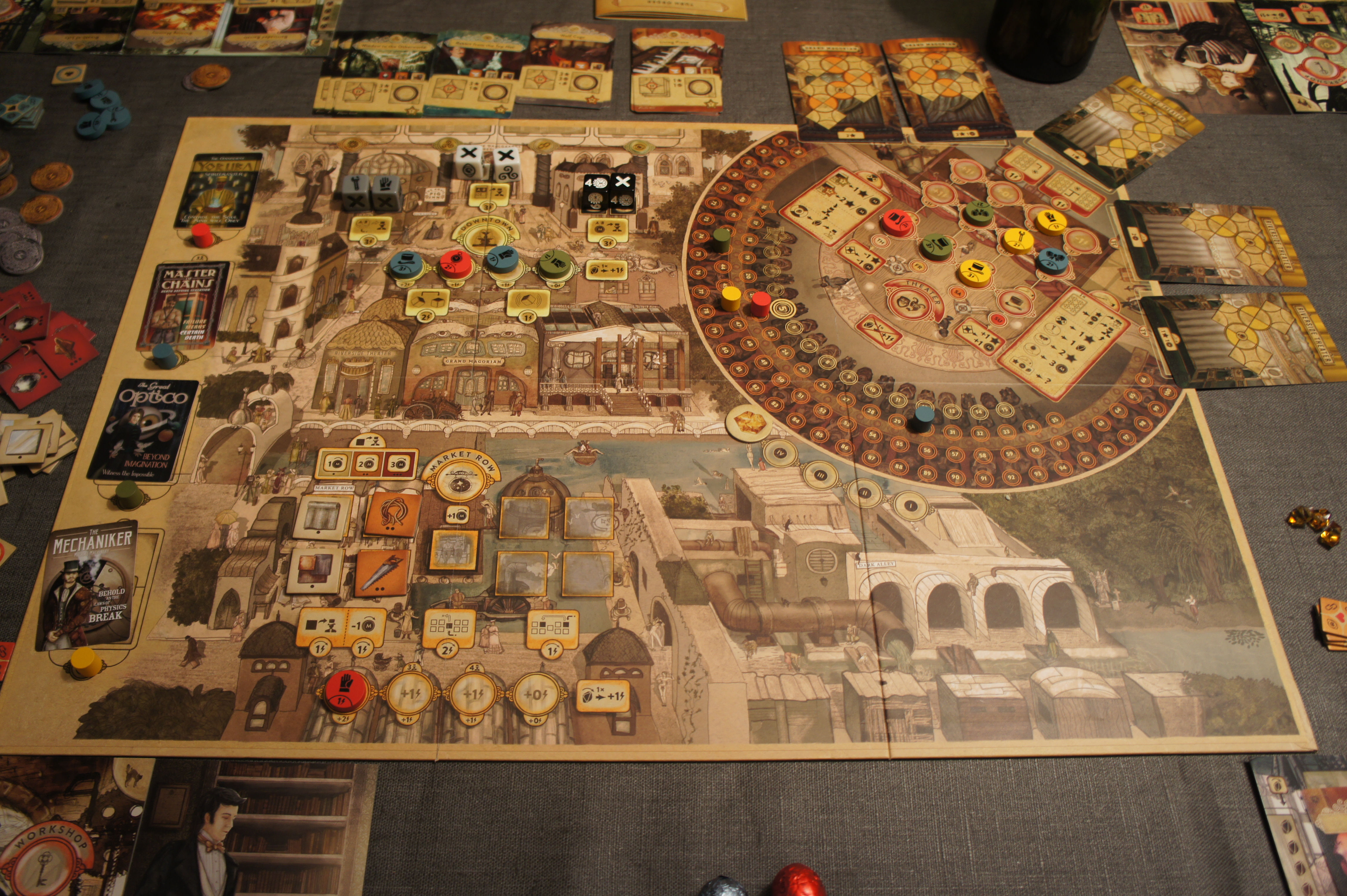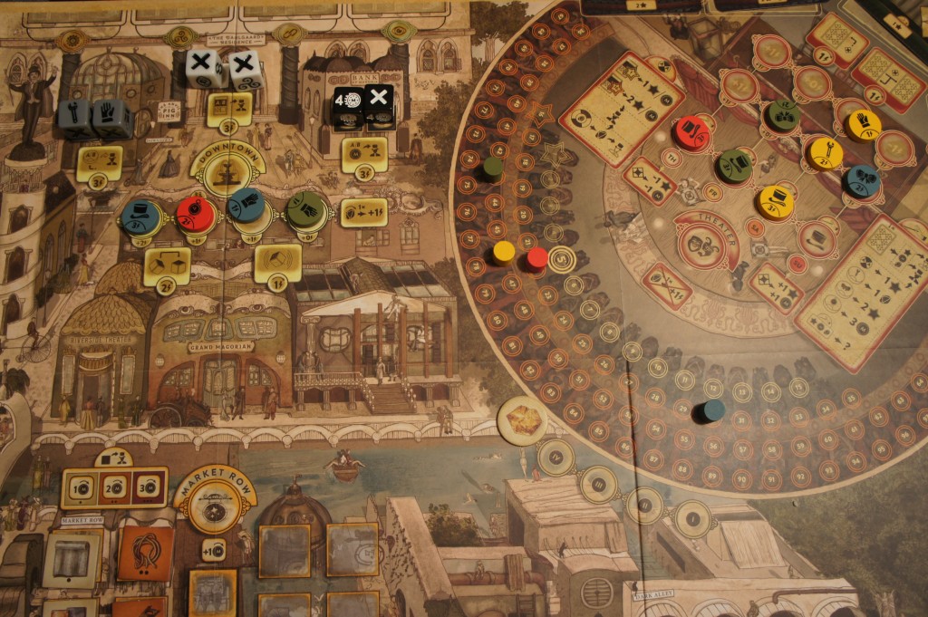 Trickerion est avant tout un jeu de gestion, de combinaisons et de placement. Les zones de placement resteront assez faciles à comprendre. Mais c’est au théâtre, que le jeu prendra toute sa dimension avec une magnifique illustration composée d’une scène, de l’arrière scène et des sièges destinées au spectateur transformés en piste de score. C’est tout simplement superbe ! A cela on ajoute des cartes format tarot pour les spectacle… A ce niveau, le jeu possède beaucoup de paramètres et ce ne sera qu’après avoir réalisé le premier spectacle, qu’on va se délecter de toute l’essence du jeu.
