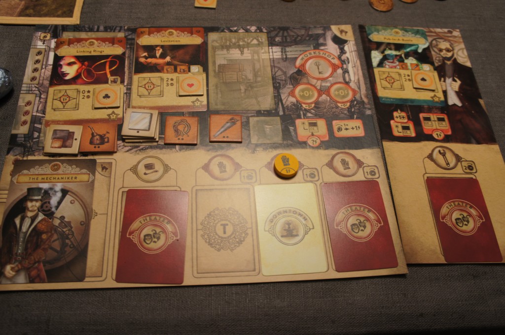 -Présenter un tour de magie. Je ne vais pas rentrer dans les détails de cette action qui est assez complexe mais elle comporte un élément de puzzle qui est étrangement bien imbriqué dans le thème et les autres mécaniques du jeu. J’adore.