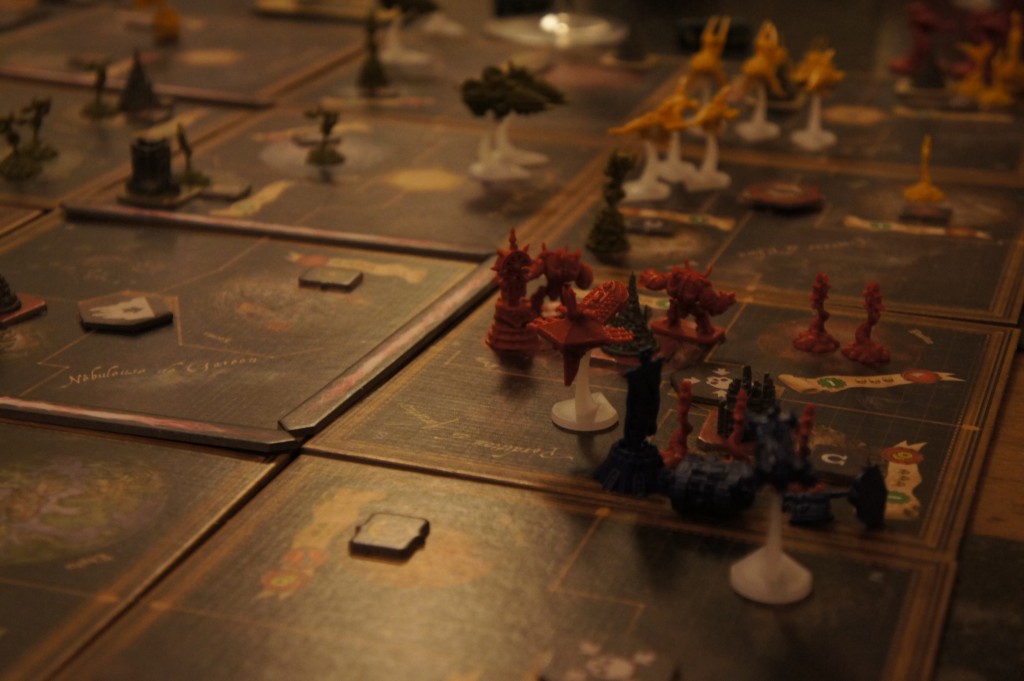 A l’exception de sa durée excessive, Forbidden Stars est un petit bijou en terme de jeu Améritrash. Il est excessivement épique et stratégique. Vous allez devoir vous fixer une stratégie afin d’atteindre vos différents objectifs. De la négociation sera nécessaire et vous allez être amenés à conclure des accords tacites ou explicites ainsi que de les trahir ou non. Vous allez devoir trouver le juste équilibre entre la défense et l’attaque. Vous allez défendre certains systèmes non seulement pour les ressources qu’ils génèrent mais également pour les objectifs qu’ils contiennent et dont vous voulez empêcher la prise par vos adversaires trop gourmands 😉 Vous devrez également bien gérer votre faction en équilibrant vos investissements entre contrôle des mondes producteurs de ressources, fabrication de nouvelles unités terrestres et volantes, fabrication de nouvelles structures et développement de votre technologie militaire et d’action. Et pour tout ça, une bonne planification de vos actions sera nécessaire. Le tout, baigné dans le thème Warhammer bien présent, est excessivement dynamique grâce à son plateau modulaire composé de systèmes rectangulaires rapides d’accès et d’un système d’objectifs favorisant la conquête rapide. Forbidden Stars est un jeu simple et brutal. Une petite, non, une grosse merveille 🙂