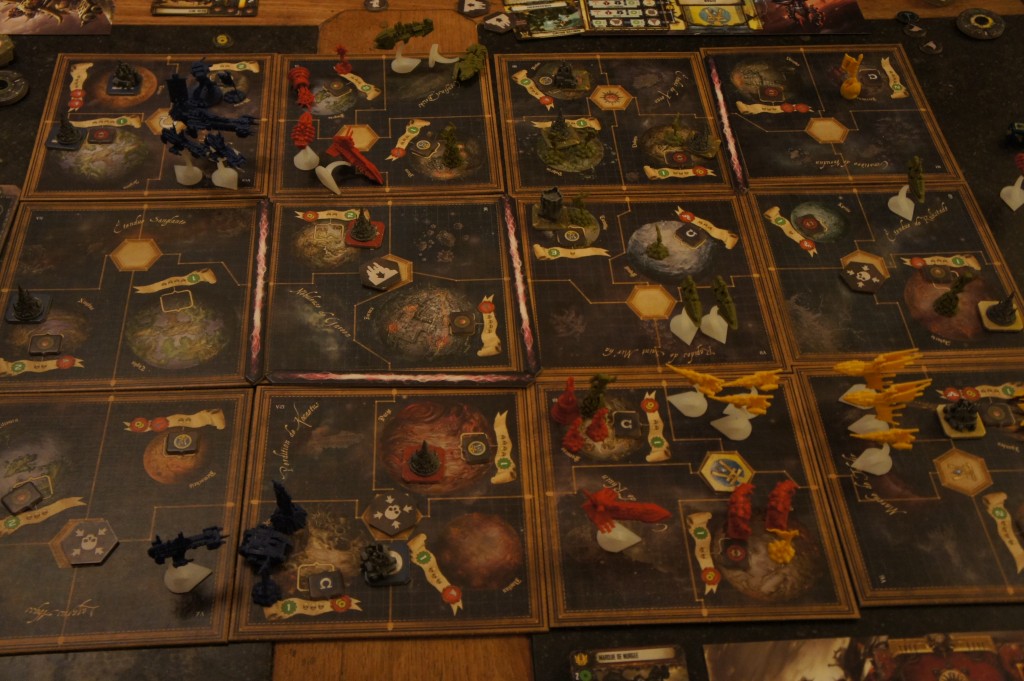 Le plateau est lui aussi original puisque, outre le fait qu’il soit modulable, il est constitué de tuiles rectangulaires chacune divisées en 4 zones comprenant soit des planètes pour les unités terrestres, soit le vide intersidéral pour les unités volantes. L’aspect génial est qu’on va se déplacer de système en système (= de rectangle en rectangle) en pouvant répartir ses unités attaquantes entre les différentes zones du système ciblé. Ca permet des mouvements assez rapides qui soutiennent le dynamisme du jeu.