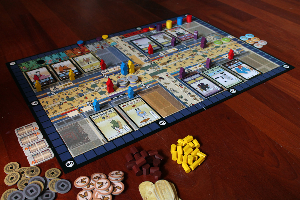 Nous allons donc choisir des artisans ou des vendeurs et les installer dans la rue commerçante principale de Edo, nous allons déplacer notre citoyen (le boss en fait, aka « Oyakata ») dans la dite rue (on va faire des aller-retour tout au long de la partie, i.e. la rue dans un sens, puis dans l’autre et ainsi de suite) en s’arrêtant aux différentes échoppes, nous allons construire des symboles de prestige pour Edo, et nous allons aider à combattre les incendies qui se déroulent régulièrement dans la ville.