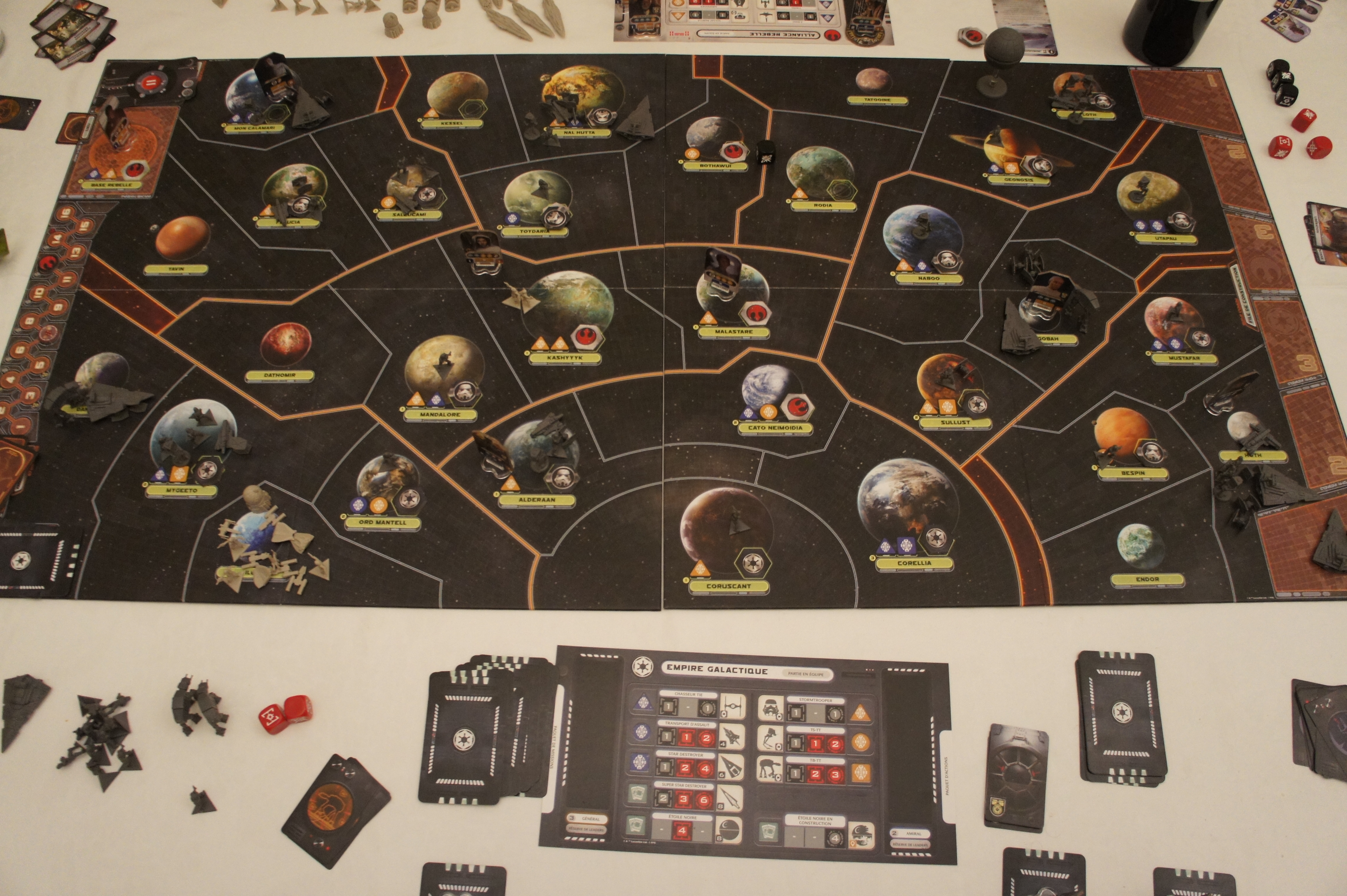 Les cartes projets : toute la puissance de l’Empire. Les cartes actions qui amènent moultes surprises ! Permettant des coups inattendus, thématiques, liés aux leaders et amenant des rebondissements à chaque fois. Les cartes tactiques de combat qui permettent de minimiser grandement la chance des dés. La chance joue mais la victoire militaire est dans les cartes tactiques ! Un peu de chance, inhérente à la  guerre et une bonne utilisation des tactiques qui est fondamentale. Excellent mécanisme, simple, thématique, réaliste. D’ailleurs un Leader rebelle peut via une carte action empêcher l’Empire d’utiliser ses tactiques spatiales, la suprématie soudaine des rebelles dans le combat prouve le rôle primordial de ces cartes. Les combats peuvent devenir vraiment épique, leur mécanique est très bien pensée, les dés, les cartes tactiques et les 2 types d’unités « lourdes » et « légères » avec des armes spécifiques efficaces sur un seul type d’unité, une simplicité dans les mécaniques qui n’enlève rien à l’intensité des combats, bien au contraire.