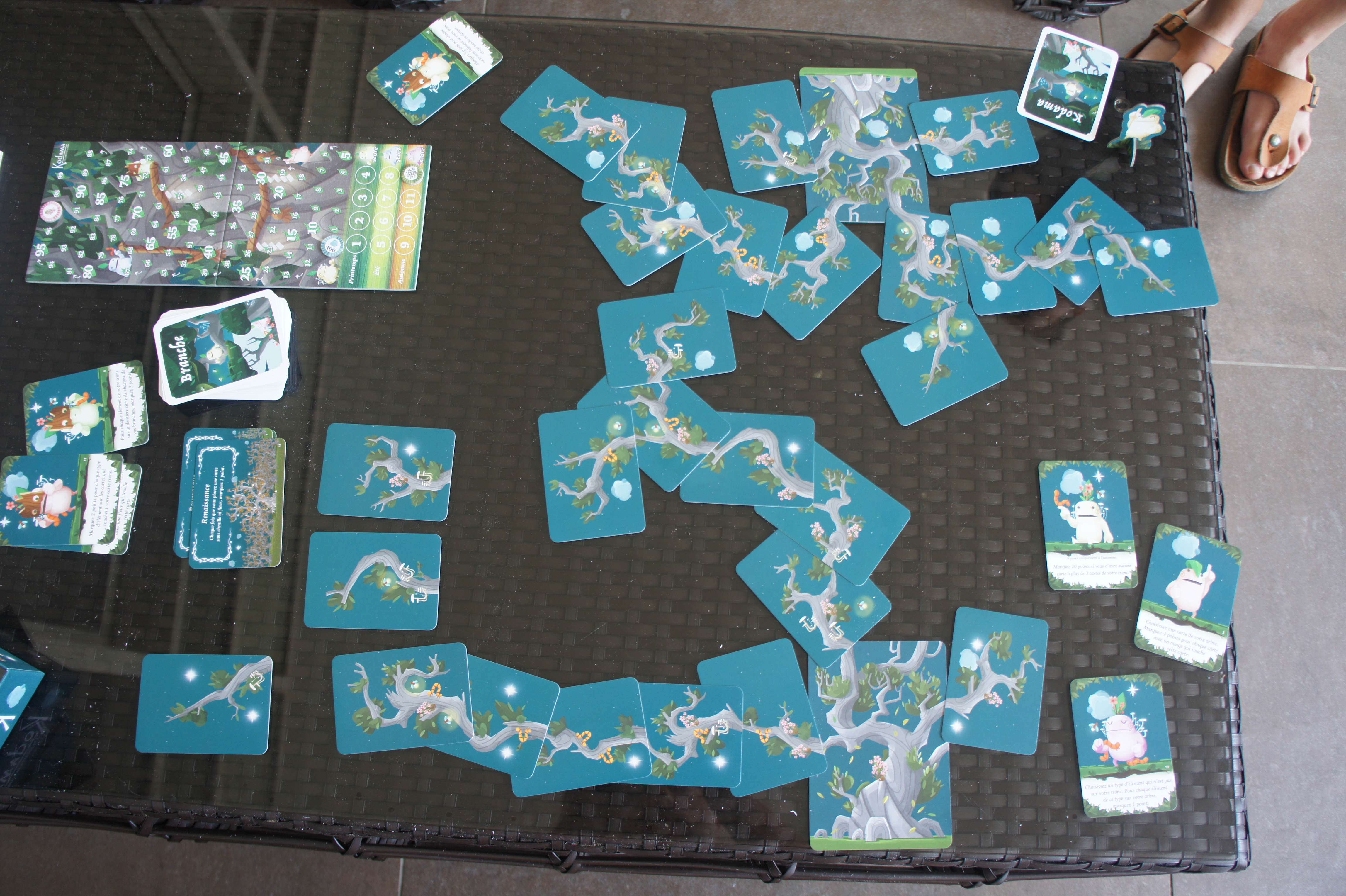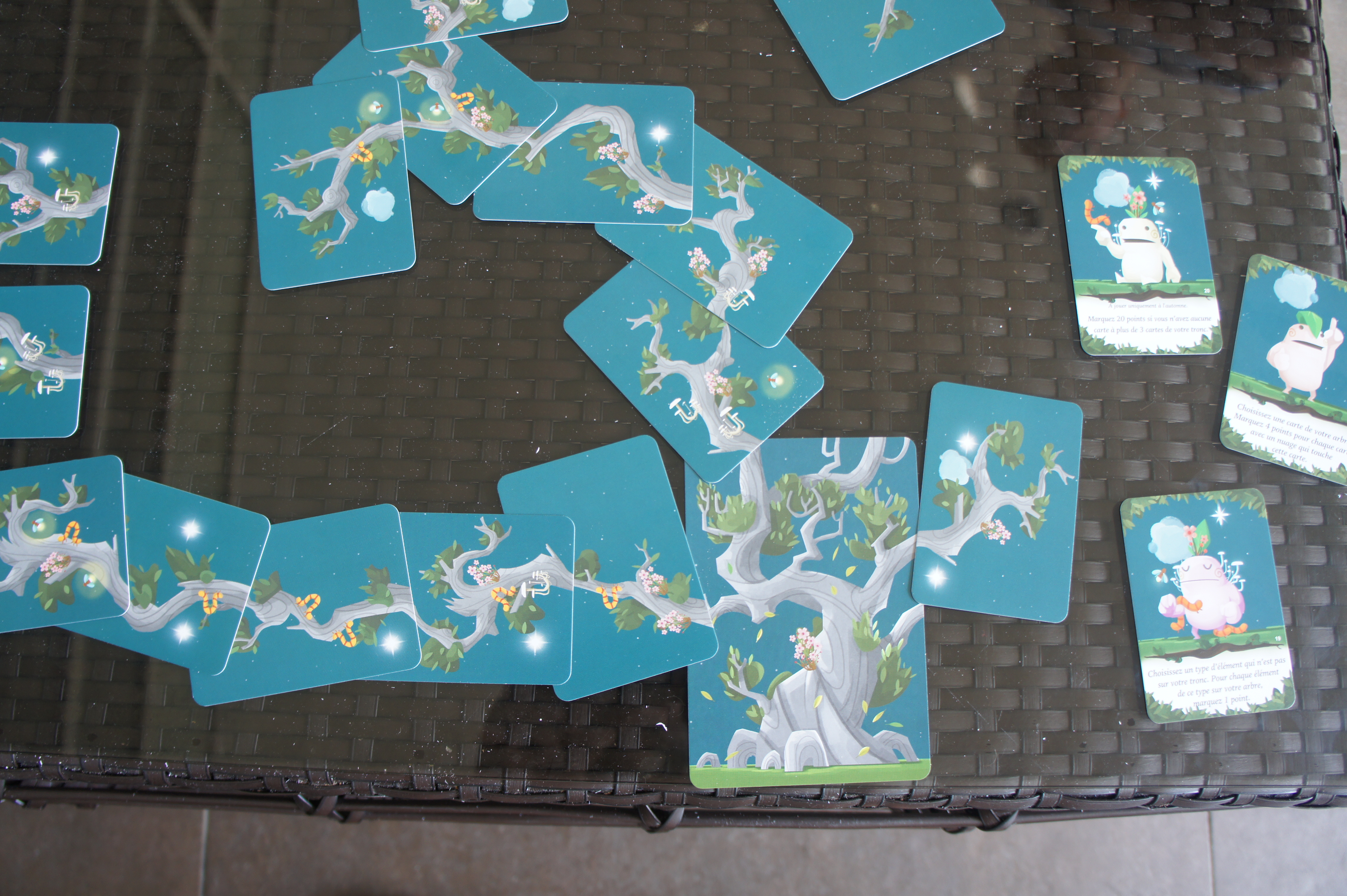 Côté mécanique, on est dans un système de choix de cartes des plus classiques : chacun à son tour choisit une des 4 cartes du présentoir et la remplace par la suivante de la pioche. Il place alors cette carte sur son arbre en prolongeant une des branches de l’arbre en respectant les règles de placement. Ce qui est important, ce sont les éléments dessinés sur la branche : des fleurs, des champignons, des chenilles, des lucioles, des étoiles et des nuages. Quand on place une carte branche sur son arbre, on va
