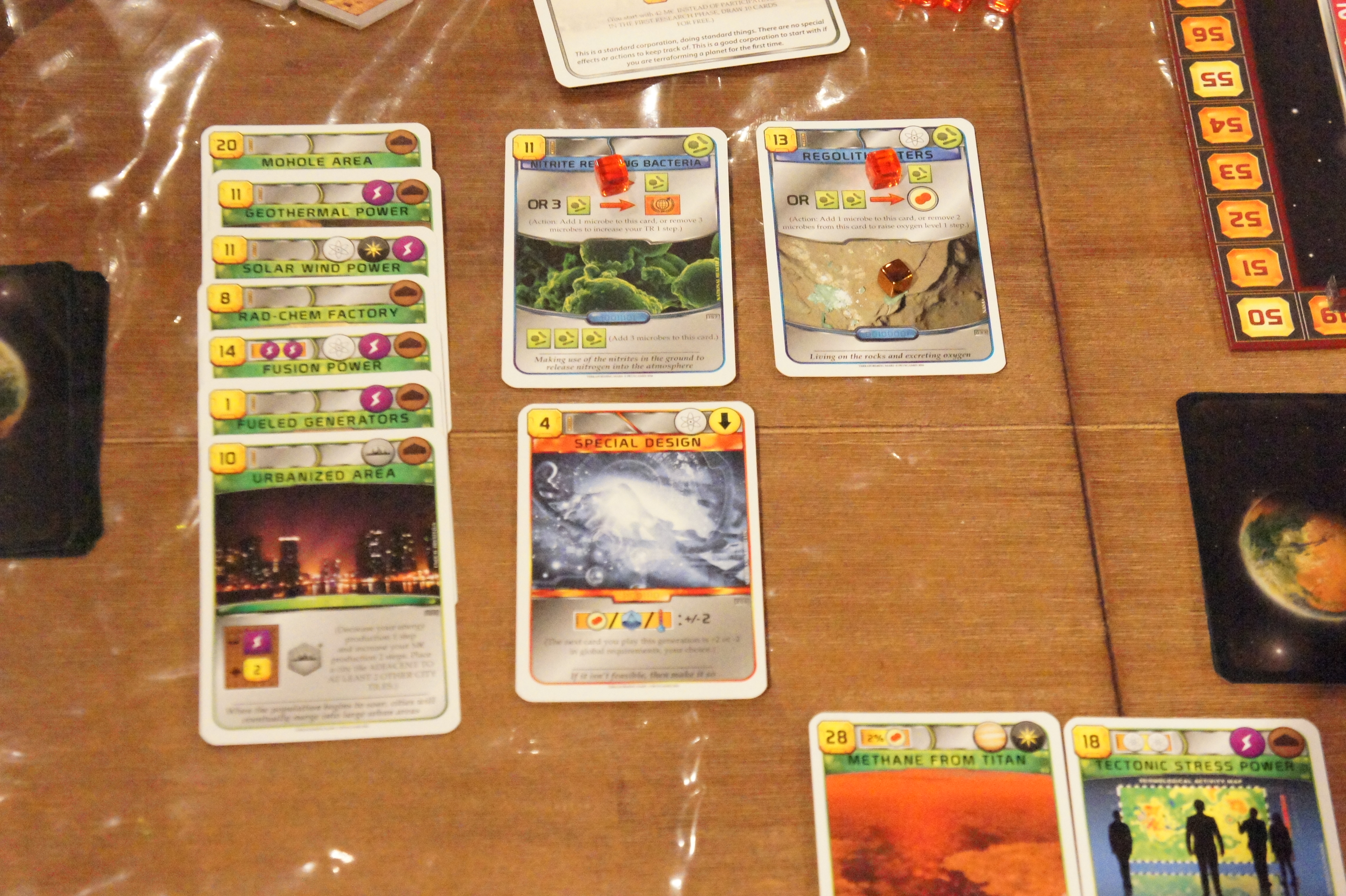 Le plateau de jeu représentant la planète va être « terraformé »: les villes, les océans, la végétation vont recouvrir peu à peu la surface. Au fil du temps, la température et le taux d’oxygène à la surface vont progressivement augmenter. Les possibilités vont alors se démultiplier: plus de cartes seront activables.