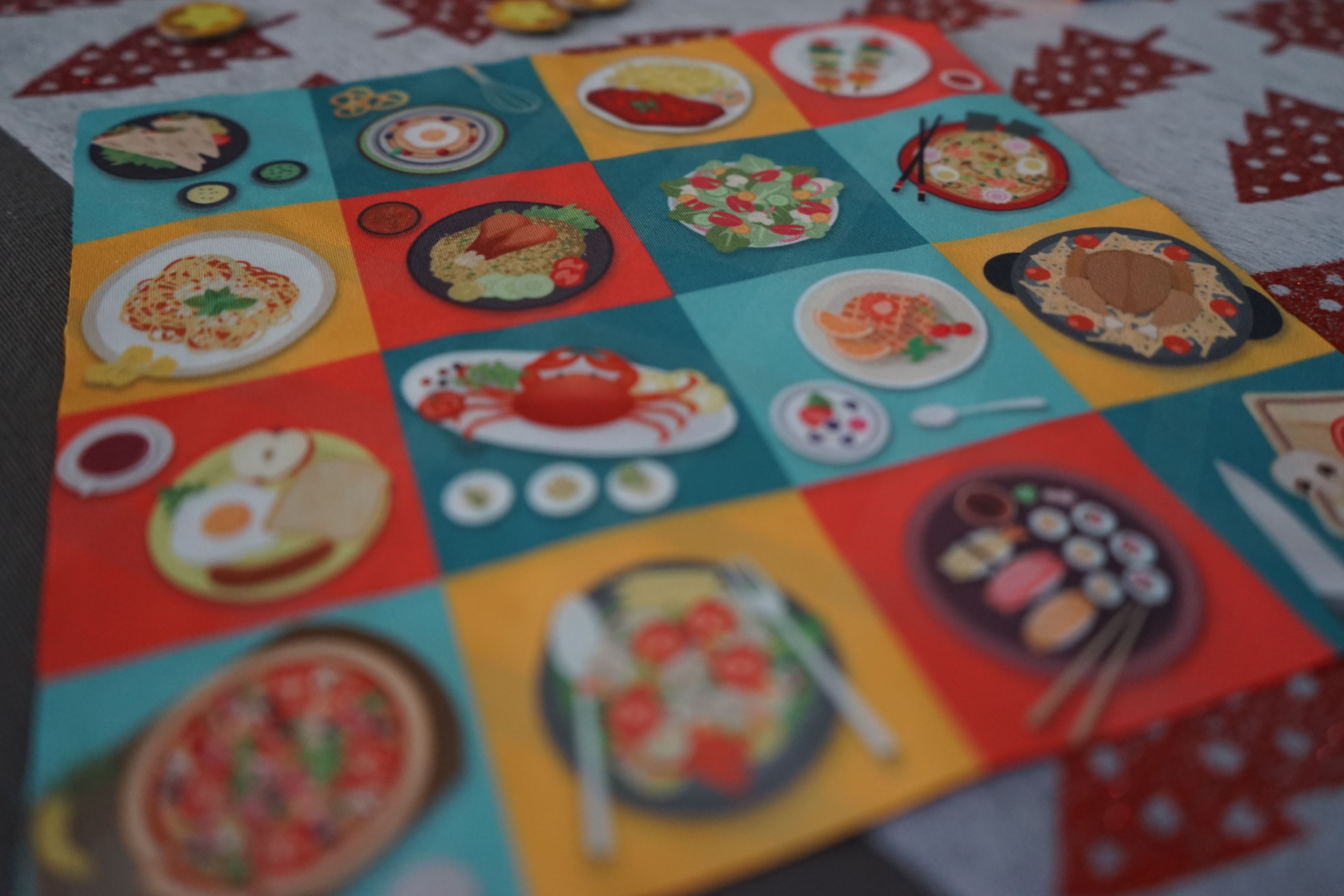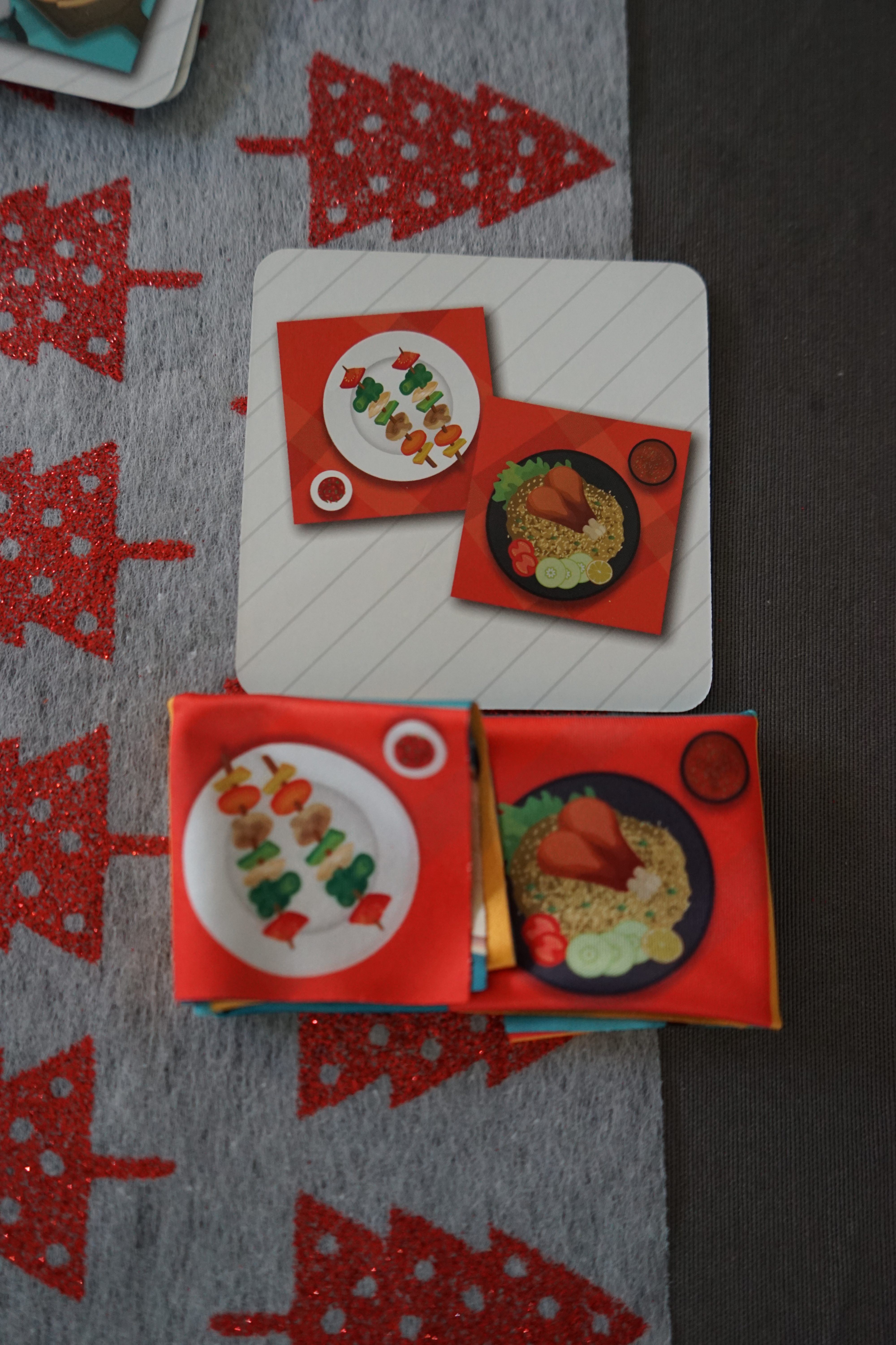 En plus de ces tissus, il y a des cartes recettes (faciles et difficiles). Une carte est retournée (facile ou difficile, au choix du joueur) et la partie commence. Chaque joueur va maintenant plier son carré de tissu afin de ne laisser visible que les ingrédients nécessaires à la recettes.