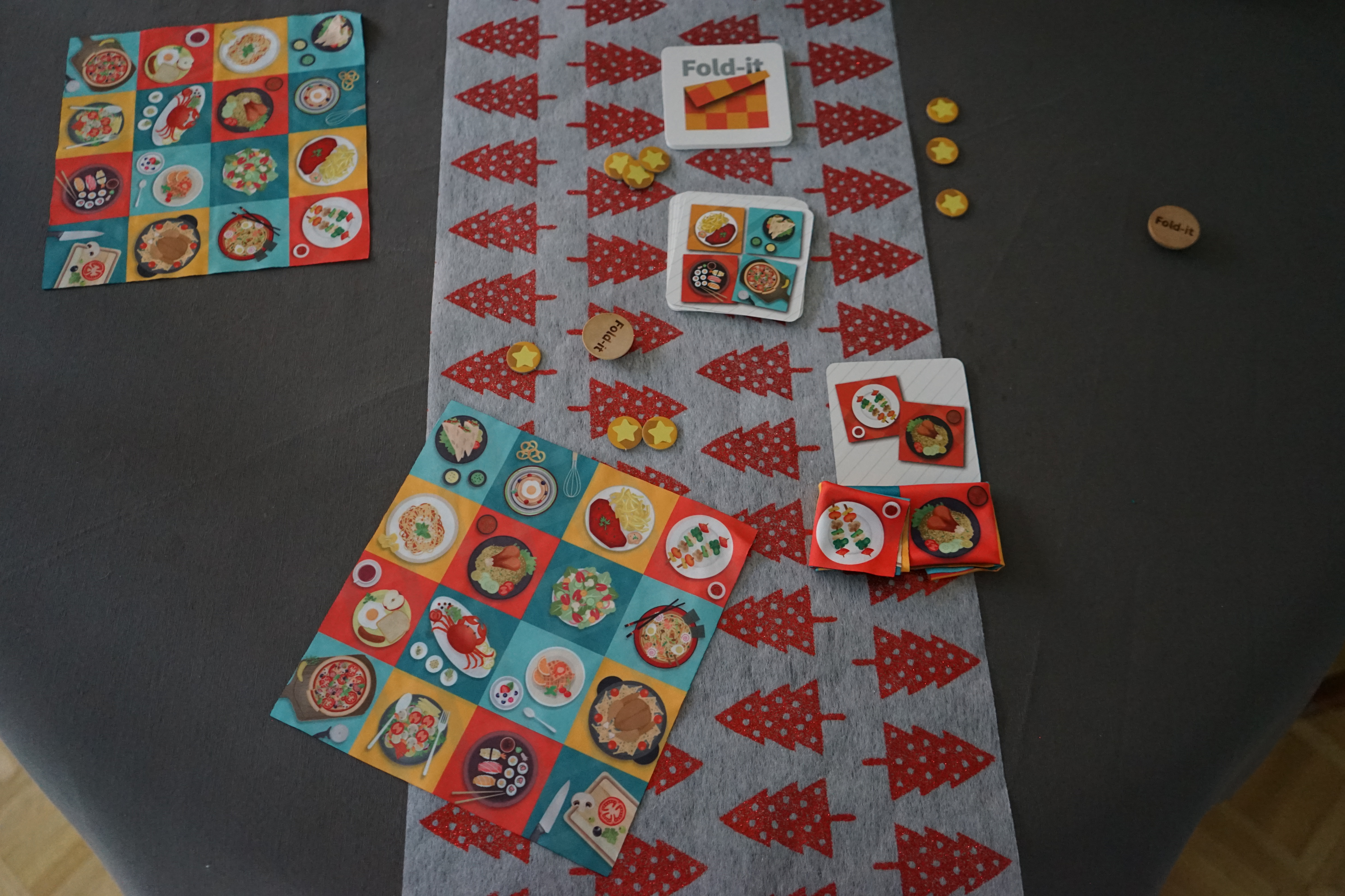 Fold-it! est un jeu d’observation et de rapidité. Chaque joueur a un petit morceau de tissu divisé en 4×4 cases sur lesquelles on retrouve des ingrédients. Une particularité importante: le tissu est bien recto verso et le recto-verso de chaque case est identique. Si vous avez une pizza sur une case, il y aura une pizza de l’autre côté. C’est important pour pouvoir jouer.