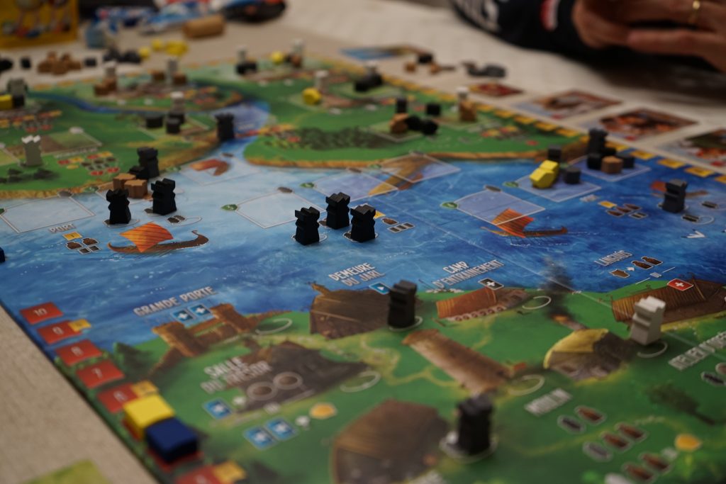En fait, on aura surtout une petite subtilité de pose et de reprise. En effet, après avoir poser un viking au village pour faire une action, on doit en reprendre un autre et faire aussi l’action où il était. C’est à ce niveau qu’il y aura un peu de stratégie… j’ai bien dit un peu, mais cela nous poussera à essayer d’optimiser ses coups. Une autre subtilité viendra aussi de la couleur des meeples qui feront varier certaines actions ou donneront accès à d’autres et seront nécessaires pour réaliser des raids de plus en plus lointain.